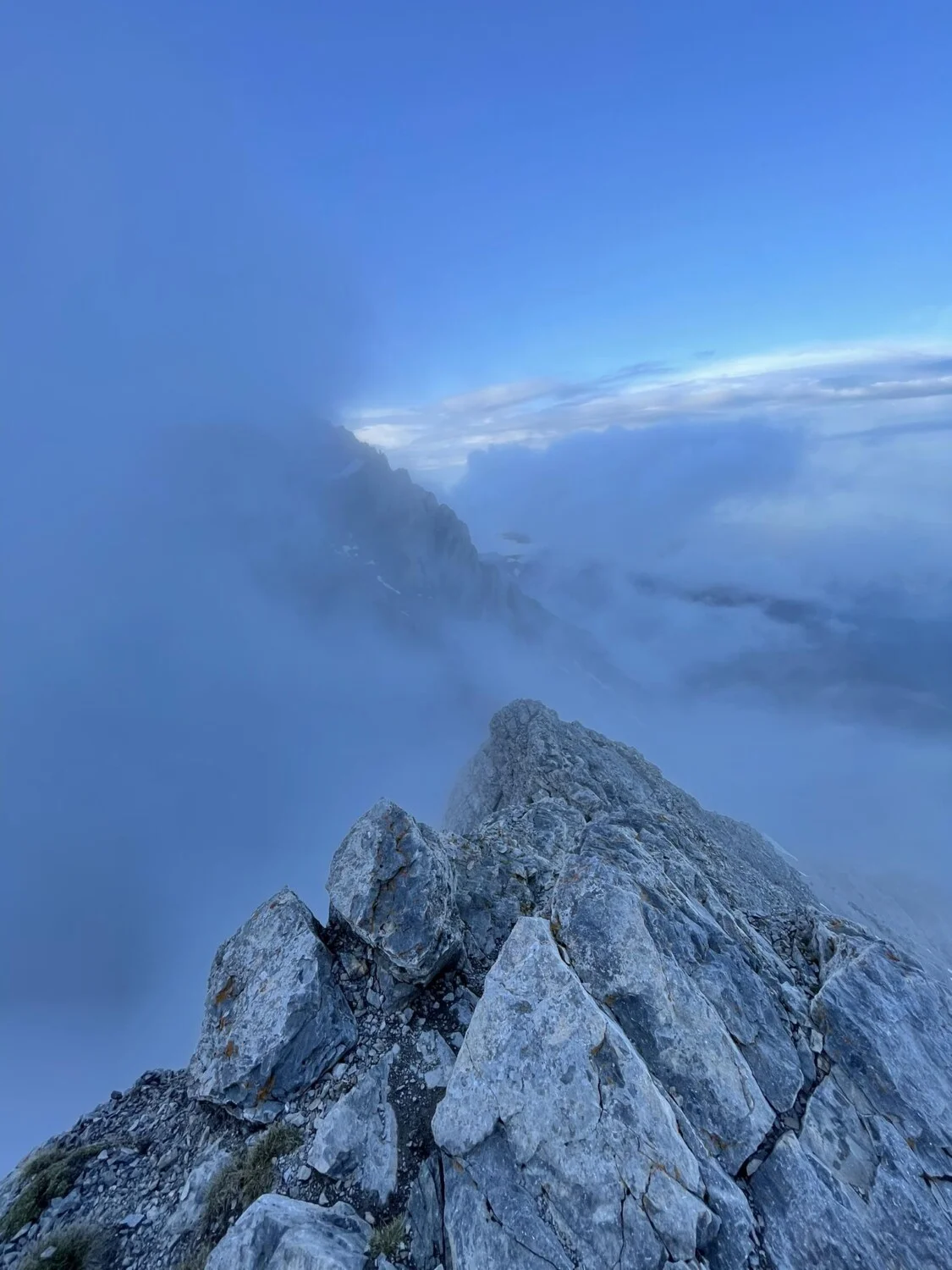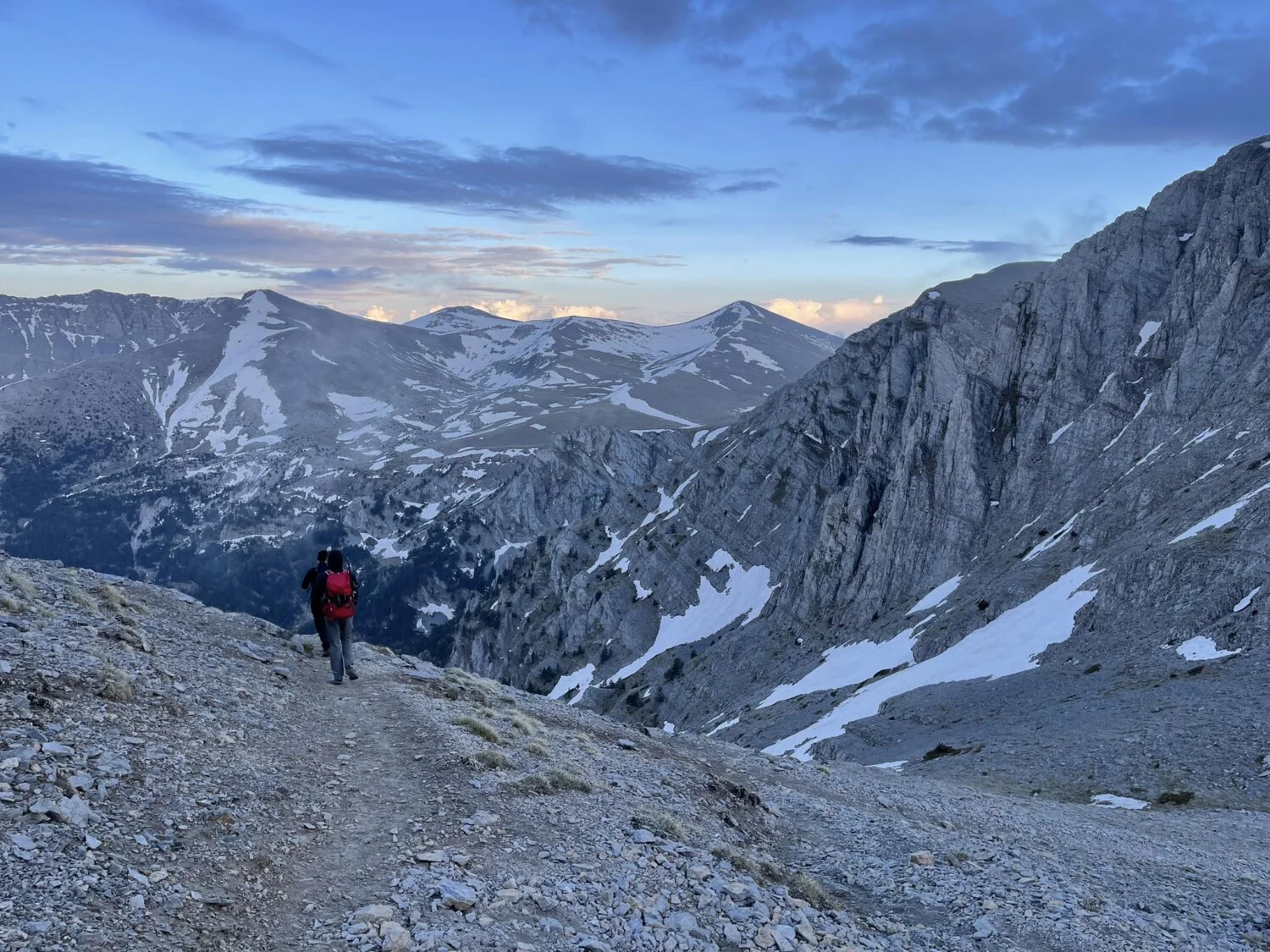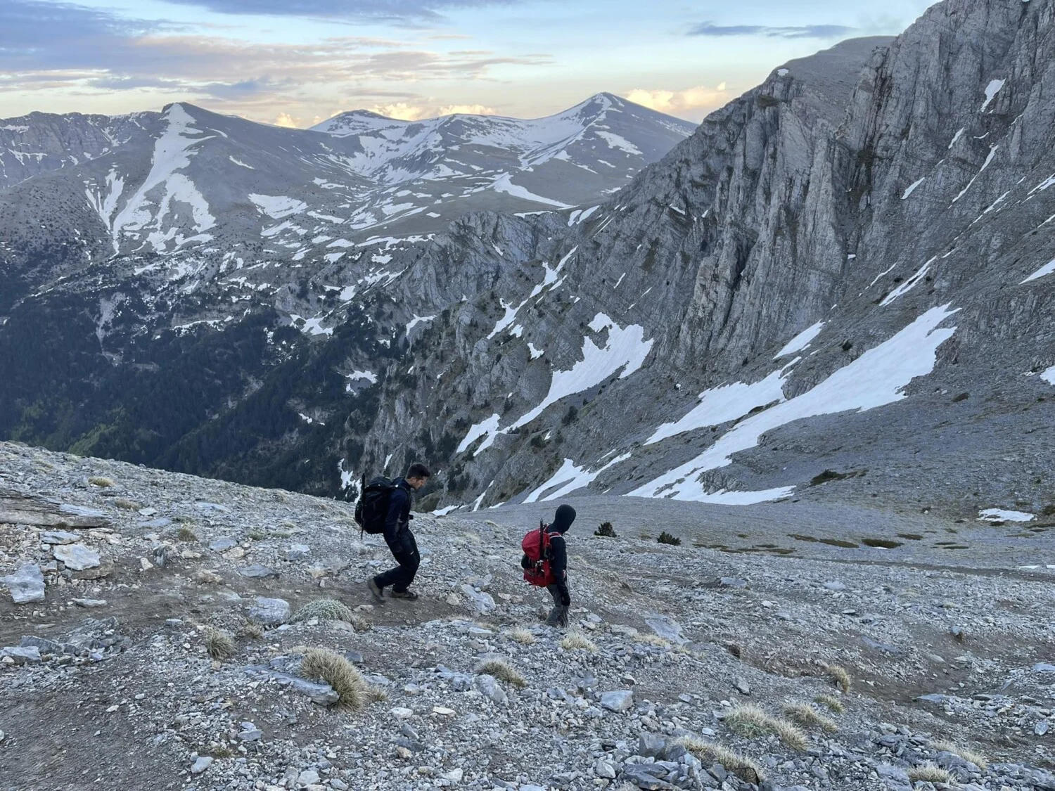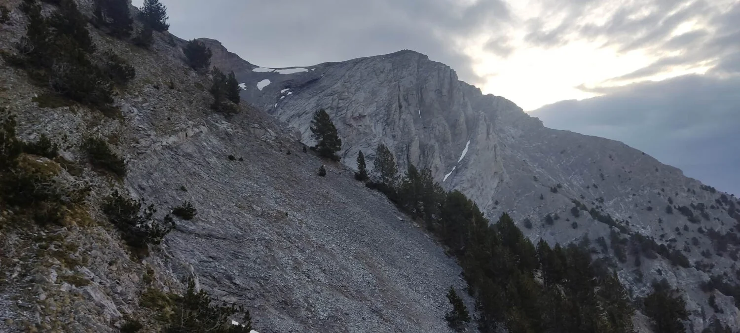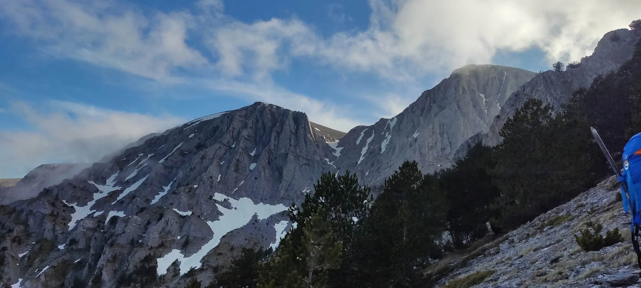 Тръгват на 29 май от паркинга Приония (1100 м) в 16 ч. и след 7,4 км и 1800 м положителна денивелация, стигат вр. Скала (2882 м). „Росен ни прекара през един по-пряк маршрут, който не е много посещаван, но е доста вертикален“, споделя Велин.