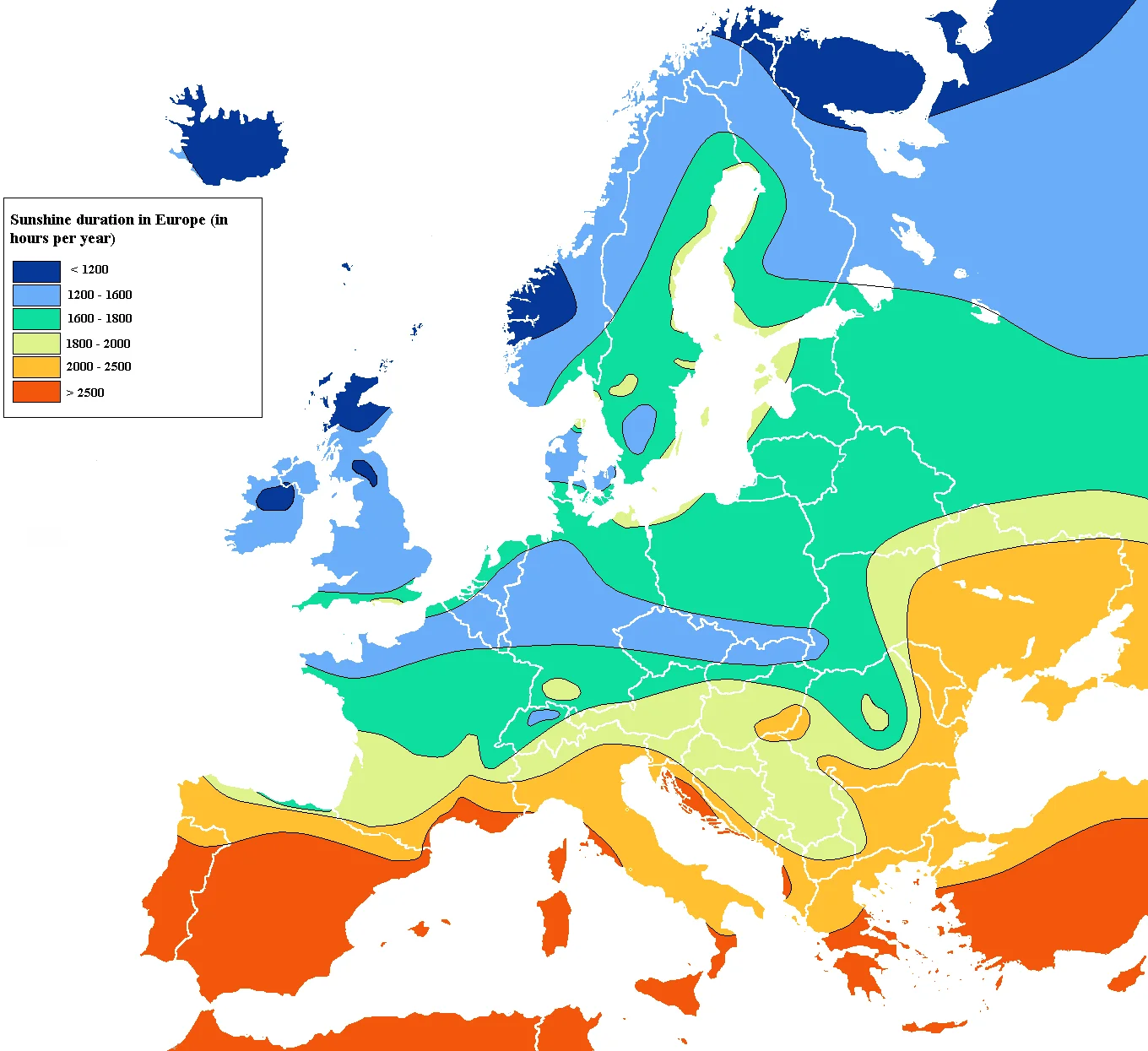Карта на разпределението на броя слънчеви часове в Европа: