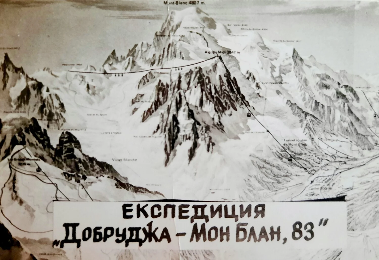 В последните дни на август поемаме към основната цел. Задачата ни е да достигнем до върха по маршрута през Дом дьо Гуте. От селцето Ле з, Уш /1007 м/ ползваме лифт, а от станцията Бел Вю /1800 м/ продължаваме до последната спирка на „Трамвая до Монблан” – „Орлово гнездо” /2364 м/. Ще нощуваме на хижа „Тет Рус” /3164 м/. Хижа „Дом дьо Гуте” /3835 м/ е запълнена месеци напред. Това усложнява задачата ни, защото трябва да поемем към върха още в полунощ. Така и правим. Когато прекрачваме прага на хижата /4.30 ч. сутринта/ много от кандидатите за върха все още спяха. Кратка почивка и се вливаме в общия поток на хора от най-различни краища на света. Тук е така, особено през юли, август и септември. В летните дни ежедневно към върха поемат между 250-300 души. Върхът Дом дьо Гуте, / 4304 м/, заслон „Вало” /4362 м/ „Камилската гърбица”- тесен заледен ръб по който винаги духа силен вятър, и върхът. На 27 август 1983 г. 10 толбухинци са на най-високата точка на Европа.