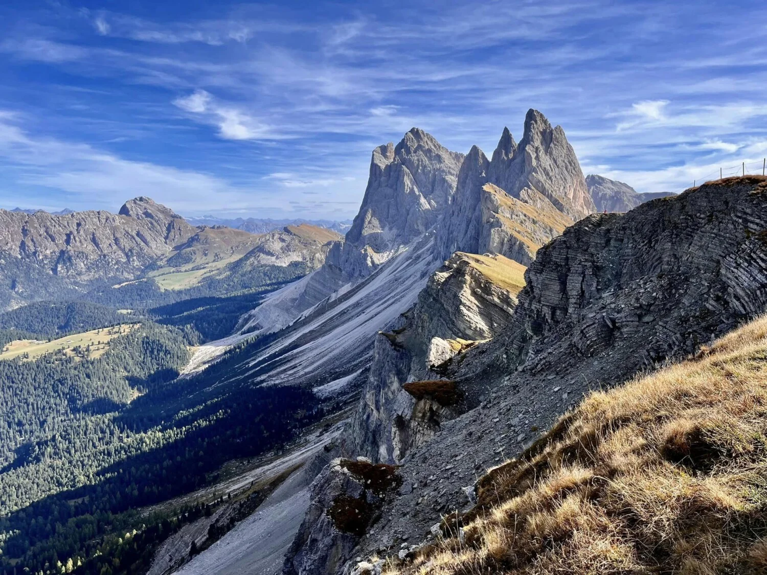 Обикновено фокусът пада върху полегатите върхове на групата Odle/Geisler (Одле/Гайслер), която е наистина една страхотна гледка, но също така ви се открива и невероятна панорама към масивите Sella, Sassolungo и Marmolada.