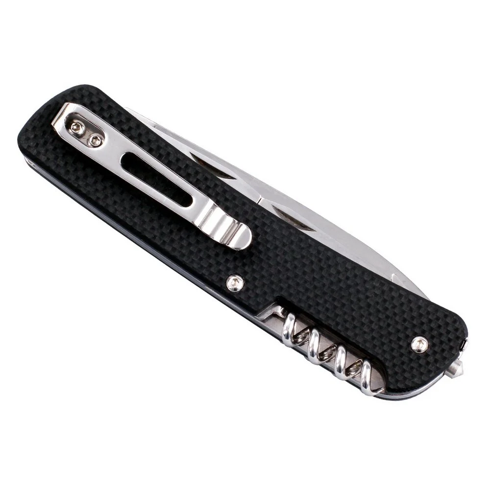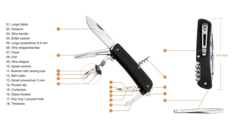 Мултитул Ruike L31-BВсички изброени инструменти могат да бъдат сгънати от страната на острието на ножа. От задната част на дръжката може да се достигне до корковата тапа, която също може да ви бъде незаменим помощник при работа на открито. Налице са още перфоратор за стъкло и халка на дръжката за закрепване на каишка към ножа.