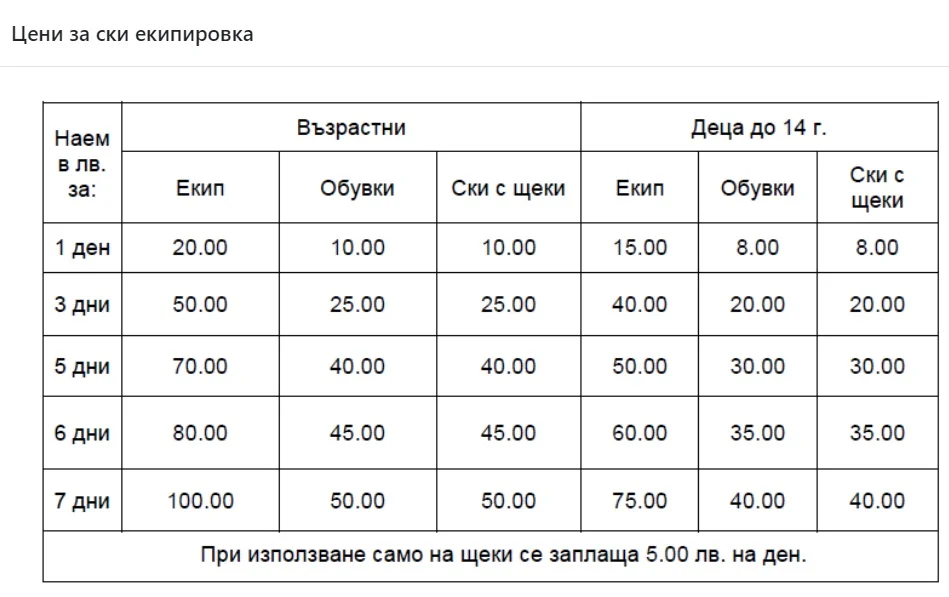 В зависимост от естеството, наем на екипировка е от 20 до 25 лв.