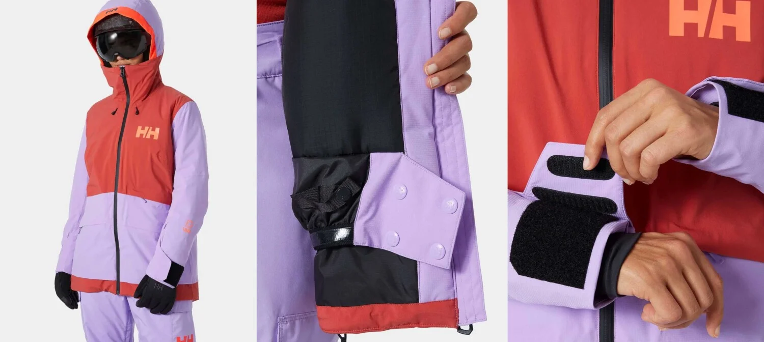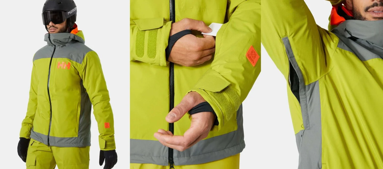 Якето не само изглежда добре, но и дизайнът му е функционален, с много джобове и регулируеми елементи. Широките маншети на ръкавите и гетите с отвори за палеца предпазват от навлизане на сняг. Към джоба на ръката има малка кърпичка за почистване на очилата от лед и сняг.