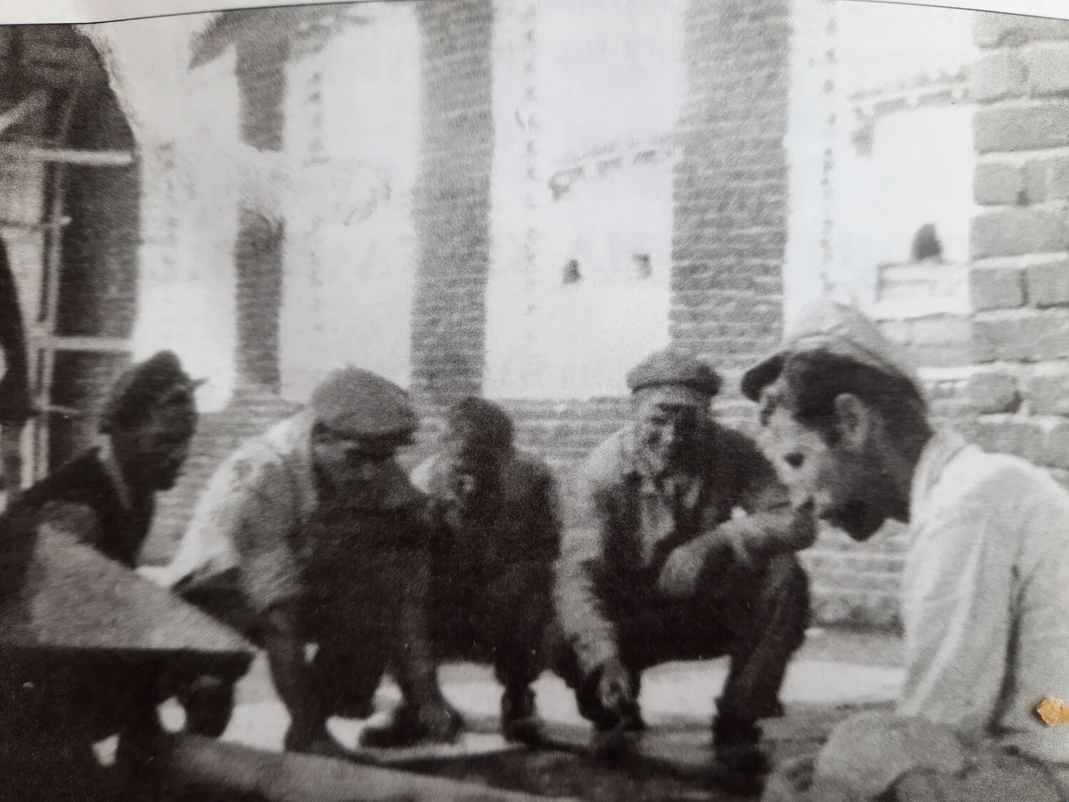 Строители разглеждат плана на хижа „Фенера“ (снимка: Архив на доц. Сандю Бешев)