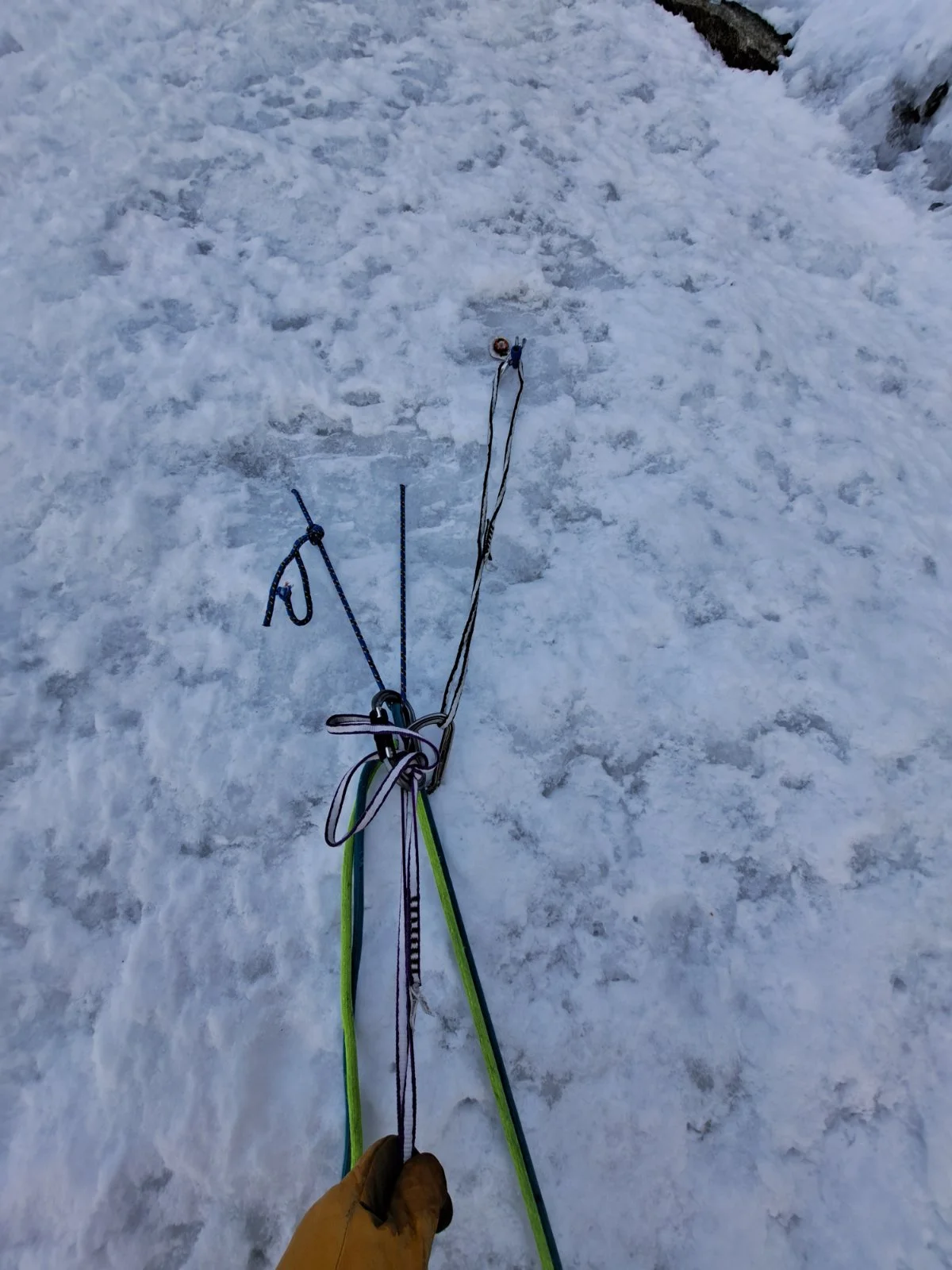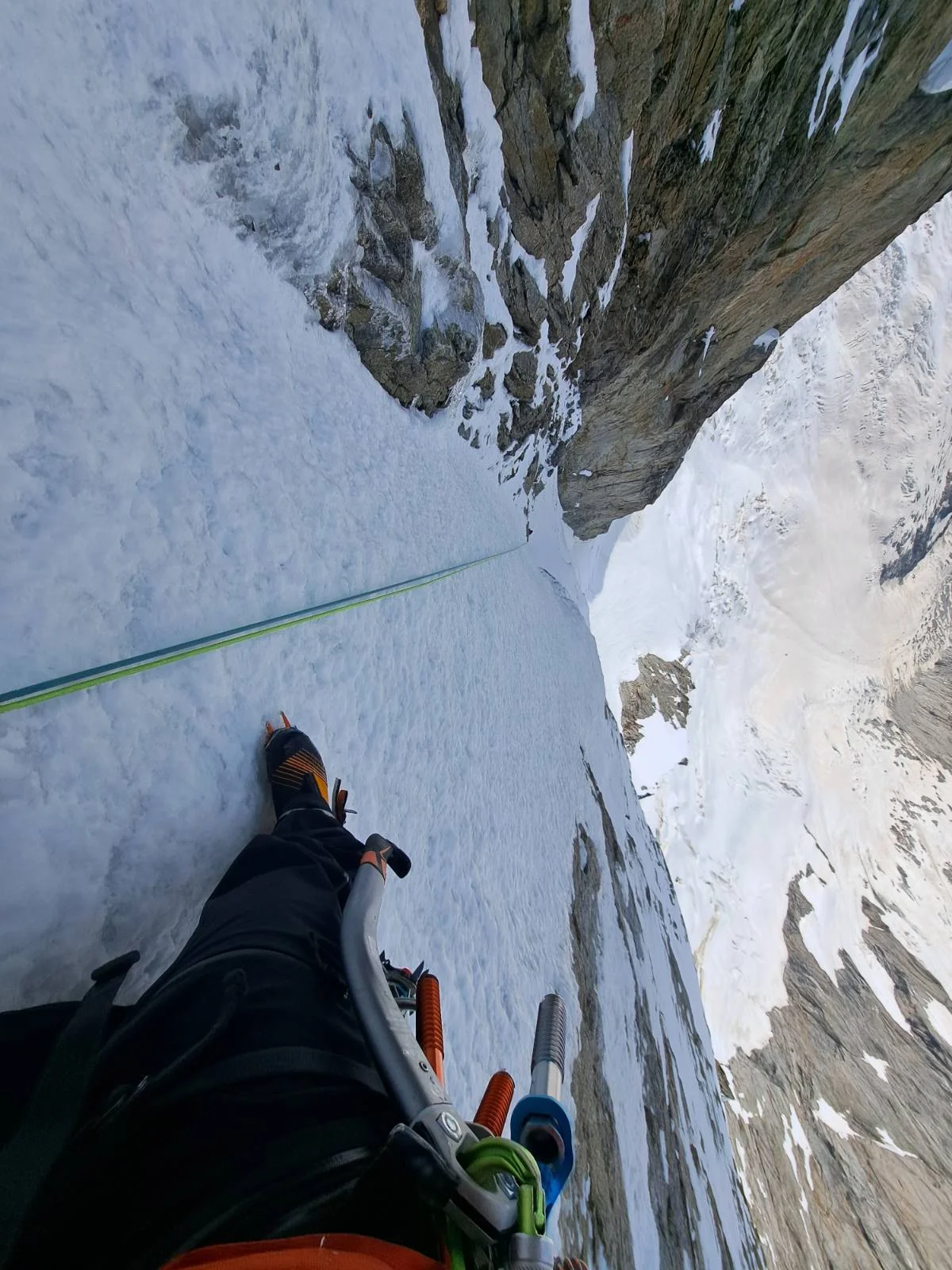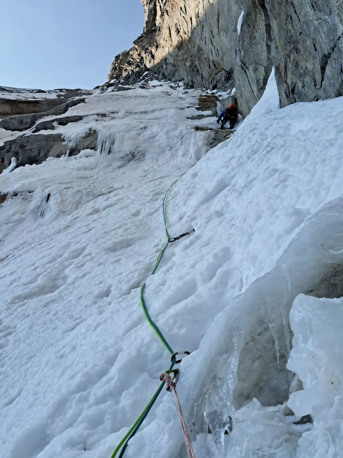 „Започваме да се осигуряваме повече и теренът става все по-труден в средата на маршрута, както си мислехме. Отдолу има скали и лед, което го прави по-труден, отколкото, ако е хубаво замръзнал. През цялото време си мисля как трябва да слезем на „Абалаков“, което означава дупка в леда, като тунел, прокарана с въженце, за да може да пуснем рапел. Но в участъците със скала е възможно ледът да не е достатъчно дебел, точно заради това правя един „Абалаков“, точно преди участъка със скали.