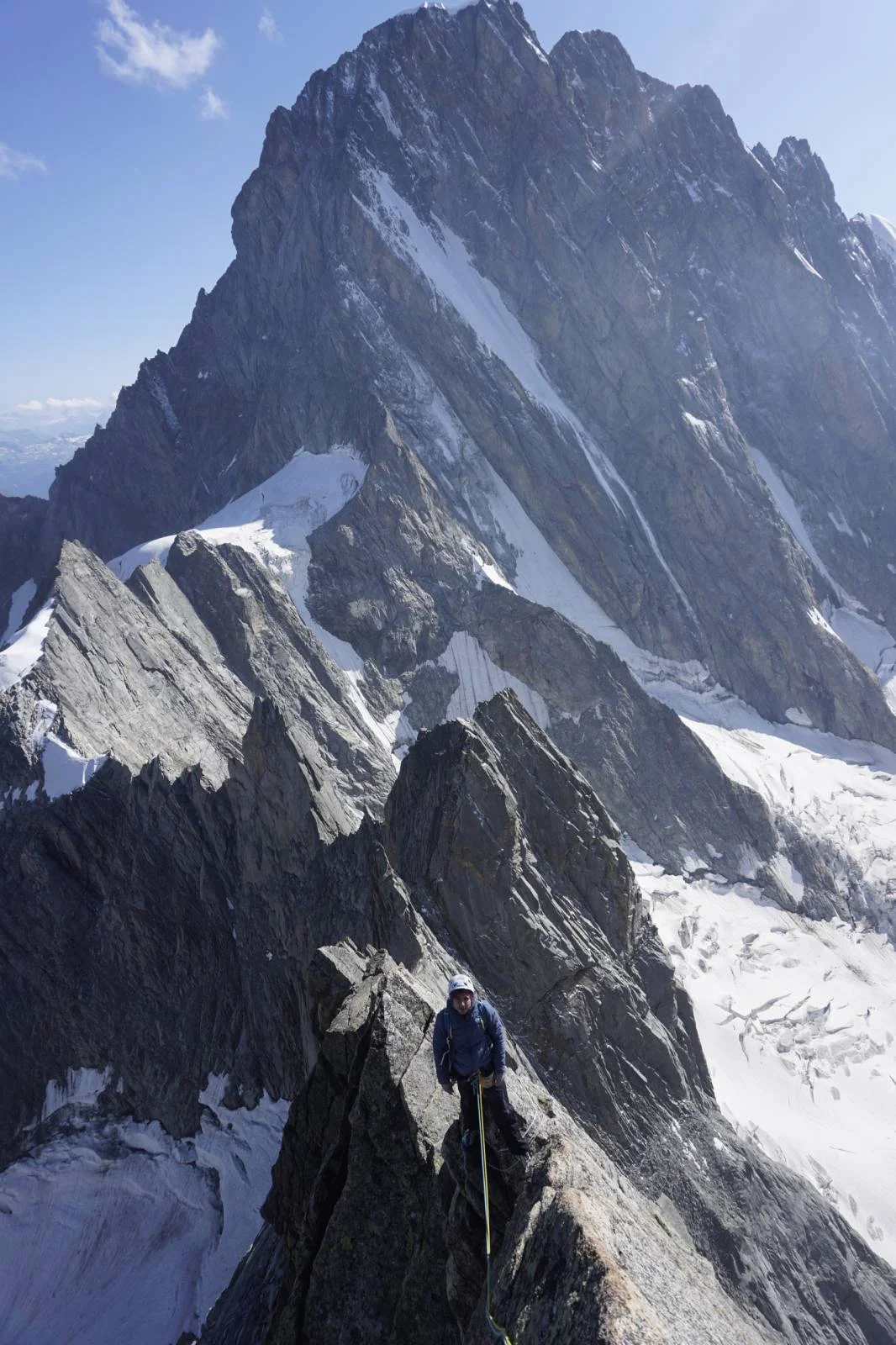 В доста голяма част от маршрута върви по плочи, но всъщност има и надвеси. Успяхме да стигнем върха за около 12 часа. Самия връх представлява ръб, който може да го обяздиш. Това беше отново границата между Франция и Италия. Точно на първия рапел от върха тръгнах да си вадя пластината, за да пусна рапел и тя ми се откачи от карабинера и падна в италианската страна. От тук нататък се очертаваше да пусна 14 рапела на протриващ възел, без пластина, което означаваше, че най-вероятно въжето ще се заплита по пътя надолу доста неприятно. За щастие обаче съумях да се справя с рапелите надолу, без особена драма и за около 4-5 часа бяхме в основата на стената. Аз бях доста щастлив, но отново много изморен. От тук ни чакаше отново няколко часа ходене до хижата пеша и поне още пет часа до Шамони.“