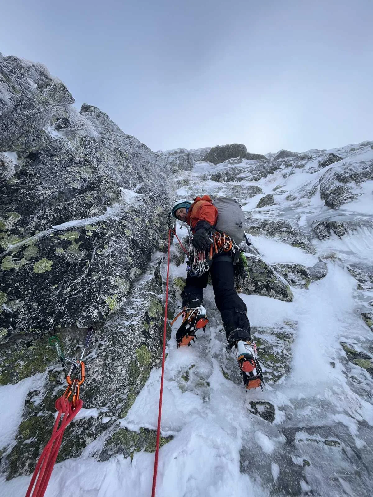 Катеренето продължаваше нагоре и в един момент излязохме на едни плочи, които бяха доста гладки и трудни за осигуряване, категорията може би беше 6а+, но всъщност бяха доста страшни, защото нямаше как да се осигуриш. След това катеренето по самия ръб на спура беше доста приятно, до момента, в който не стигнахме едни участъци, в които имаше лед и скалата се беше споила само и единствено заради леда, което означаваше доста технично катерене. И с много внимателна преценка точно за какво ще се хванеш след 150-200 метра неосигурено катерене, успяхме да излезем на върха. Мисля, че беше четири на обяд, а тръгнахме в два през нощта да се катерим.“