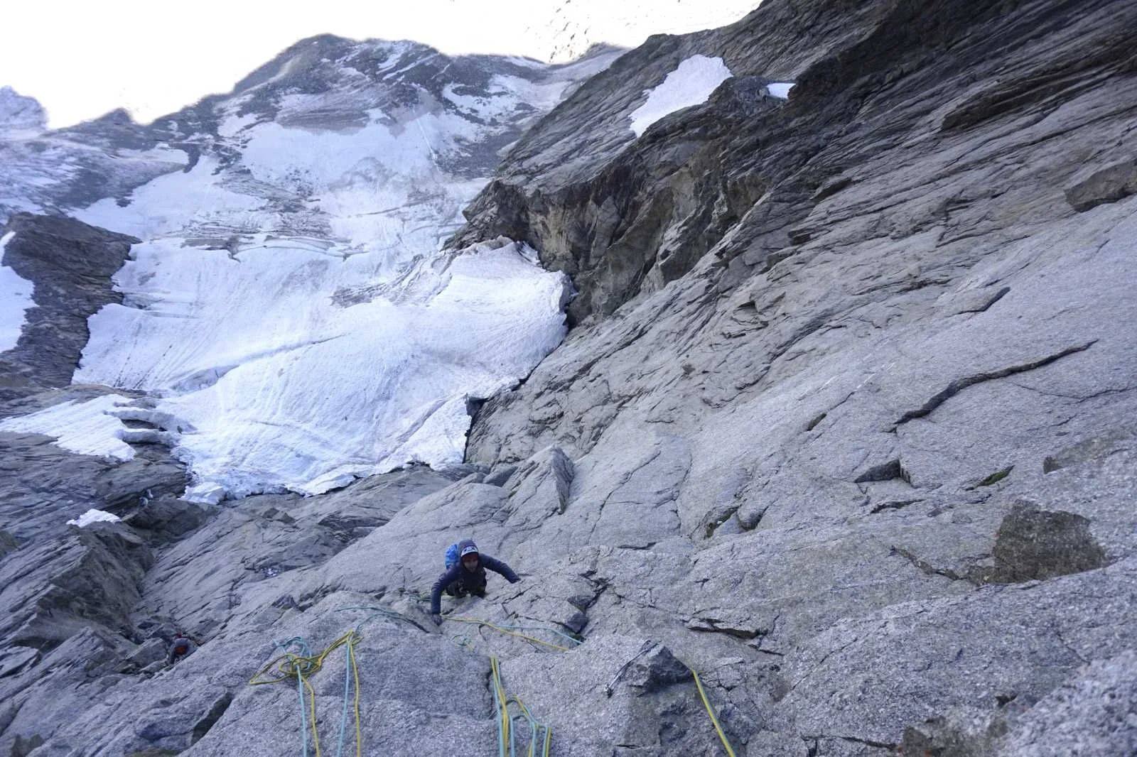 Тръгването към стената по замръзналия глетчер е доста зловещо, защото си сам срещу тази огромна крепост и във всеки един момент можеш да пропаднеш в цепката. Вързани за въжето, с Алеко внимателно напредваме, даже на едно място почваме да се катерим през глетчера, още преди да сме стигнали стената. Стигането под стената и траверсирането под нея, за да хванем точно замръзналия маршрут (който всъщност в тази му част е горе-долу добре замръзнал), но в мен все още има несигурност от катеренето нагоре, която не свършваше през цялото изкачване на маршрута и слизането му. В първата част се катерим почти без осигуряване между нас, на френска свръзка, защото теренът не е много труден, но по-нагоре се изправя и започва катеренето на доста отвесни участъци от четвърта категория лед.“