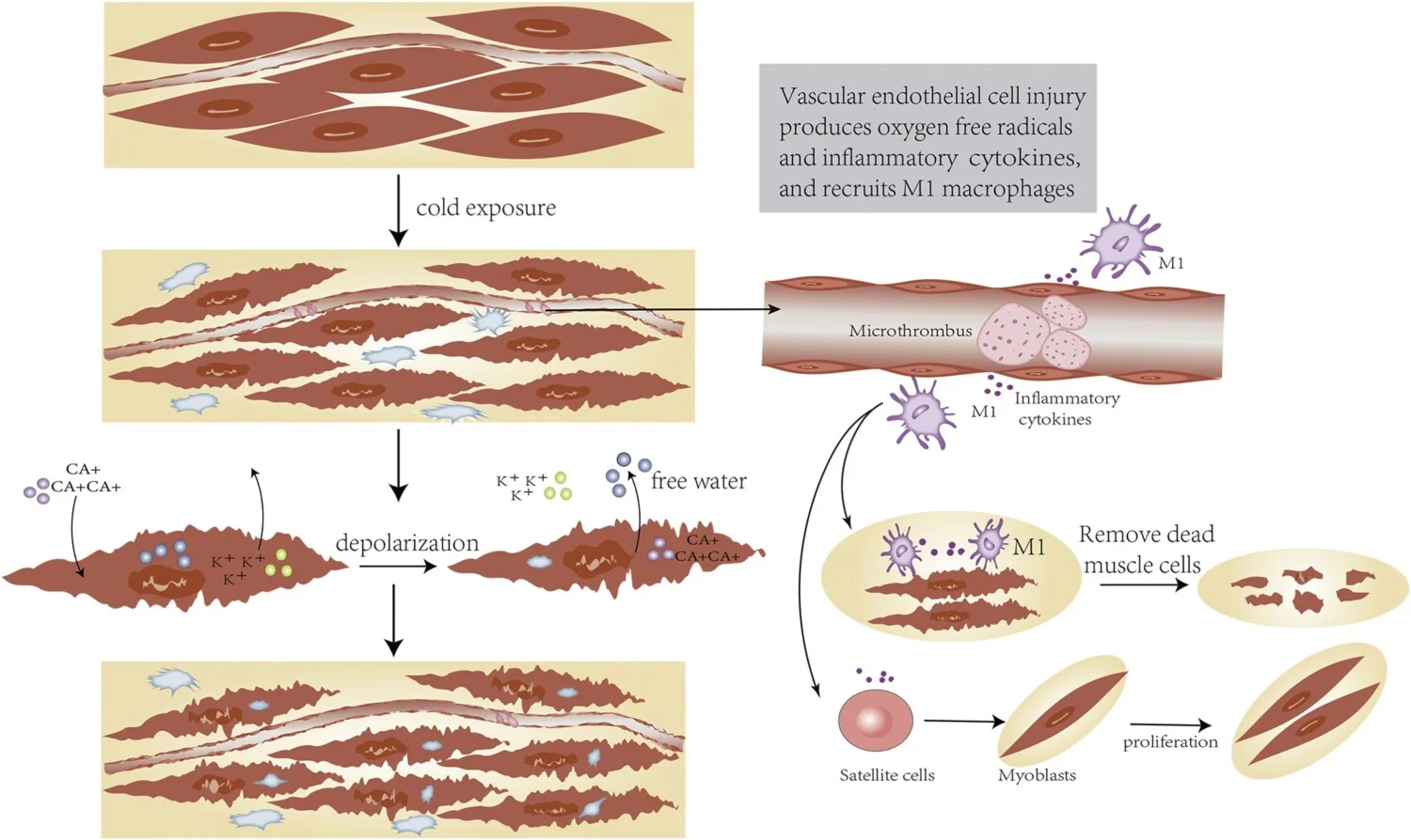 При измръзване, промените в тъканите са в три посоки – извън- и вътреклетъчно образуване на кристали, клетъчна дехидратация и недостатъчност на артериалното кръвоснабдяване. Ниските температури са причина за свиване на кръвоносните съдове с нарушаване на кръвния поток и развитие на хипоксия и ацидоза, а впоследствие и тъканна некроза. Характерно е, че водата от вътрешността на клетката преминава в междуклетъчното пространство. Така в клетката се създават условия за кристализиране на течното съдържимо, което е причина за механичното ѝ увреждане.