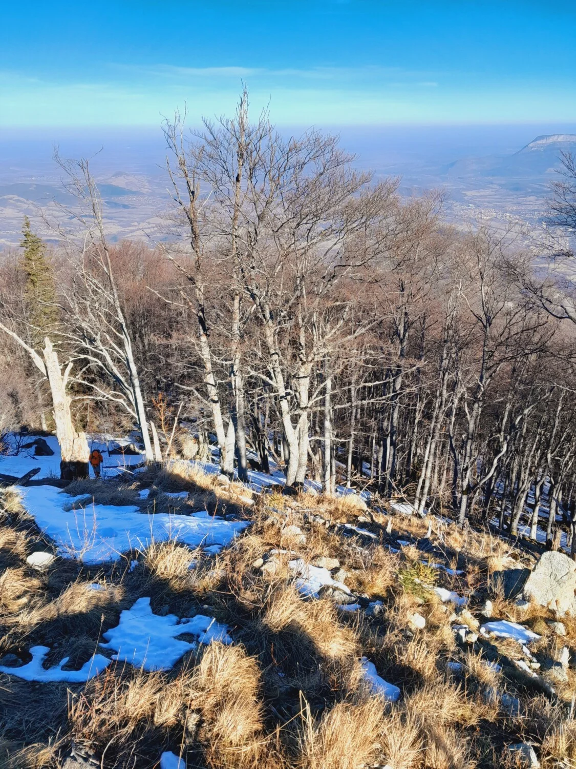 Добрата новина беше, че в далечината пред нас се видя зимна маркировка. Жълто-черните колове бяха полъх от цивилизация и значително облекчение за вече леко напрегнатия ми мозък. Почти на бегом стигнахме до първия кол и видяхме, че има още един в посока надолу, към гората. Тук обаче свършиха добрите новини. Оказа се, че снегът, който на билото беше мек и приятен за ходене, взе да става все по-твърд на места, а като доближихме гората склона ставаше все по-стръмен.