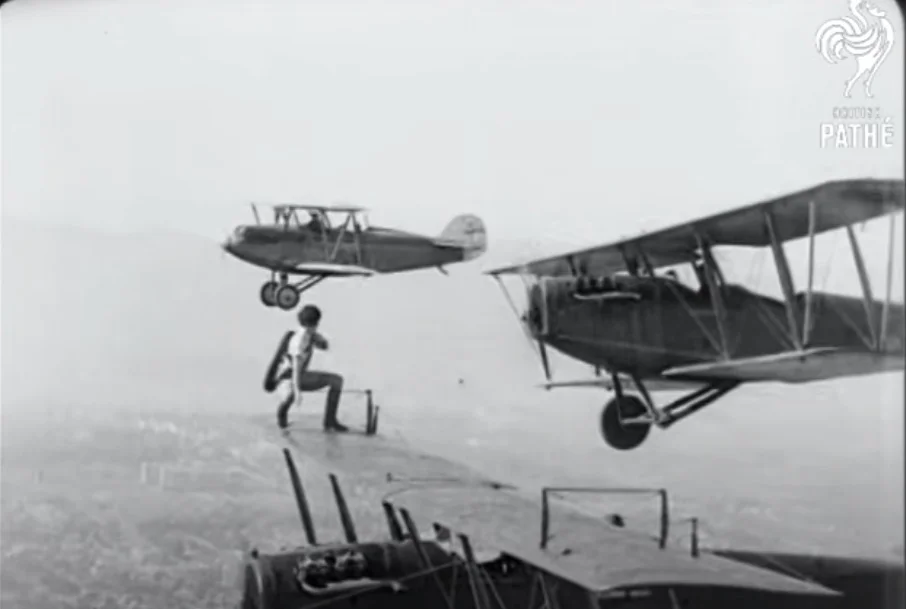 На въпросния клип се вижда как сменя колело на биплан, докато той лети на хиляди метри от земята. По онова време мерките за здраве и безопасност не били от първостепенна важност, така че смъртоносните каскади често били изпълнявани лекомислено, без никакви предпазни средства.