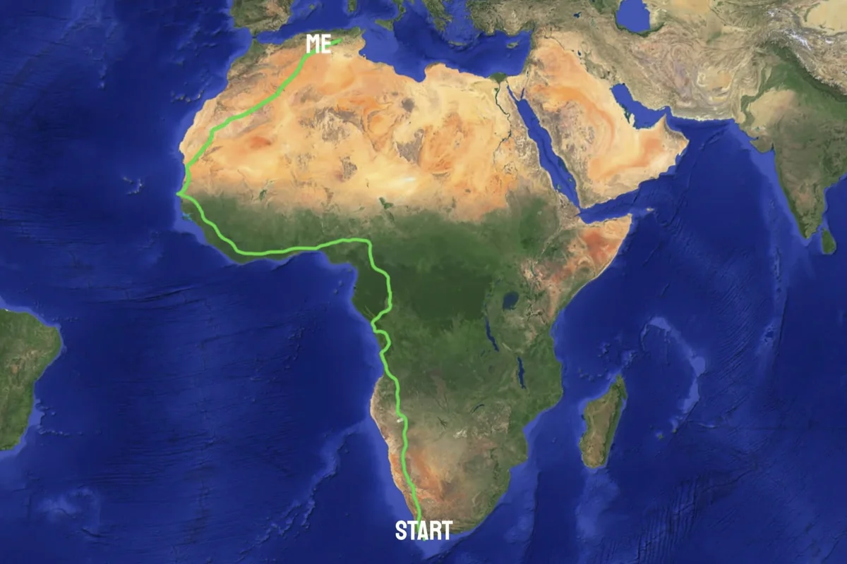 Младият мъж прекосява държавите Намибия, Ангола, Демократична република Конго, Република Конго, Камерун, Нигерия, Бенин, Того, Гана, Кот д’Ивоар, Гвинея, Сенегал, Мавритания и Алжир, преди да пристигне в Рас Анджела в неделя вечер, местно време.