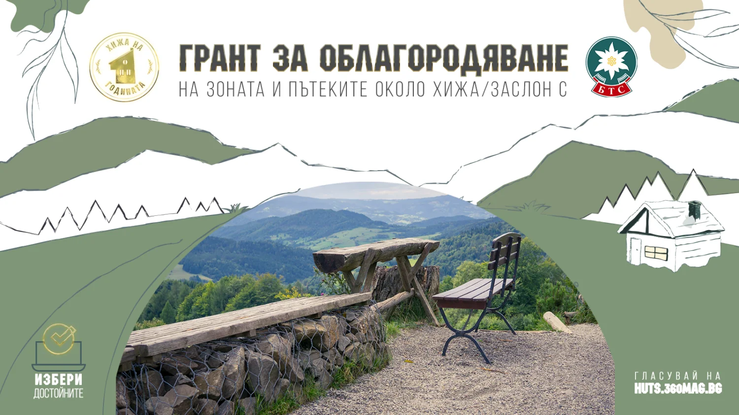 За да стане още едно място в планината по-привлекателно, сигурно и удобно, Български туристически съюз се включва в кампанията „Хижа на годината“ с грант за облагородяване на зоната и пътеките около хижа/заслон, на стойност 5 000 лева.