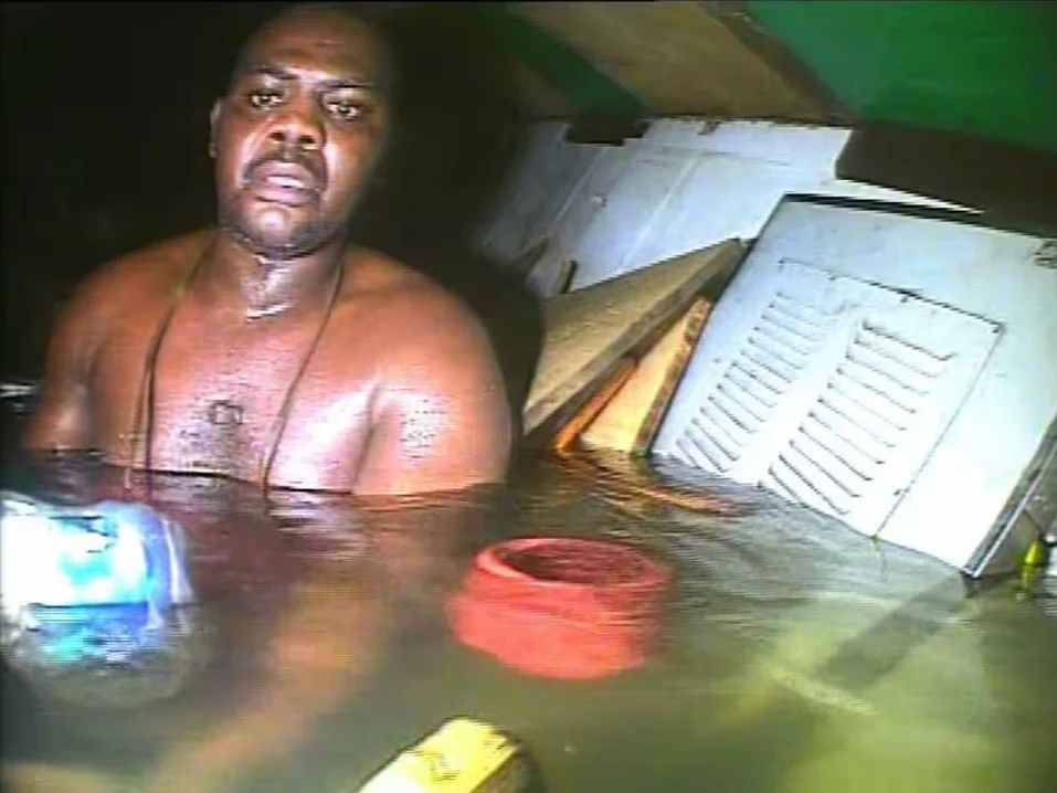 Той държи главата си в малкия въздушен джоб под тавана, който в действителност е подът, прилепнала към дъното на мивката. Затворен в тъмното, чува колегите си, които викат и плачат.