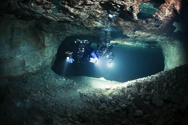 Подводните пещери, от своя страна, също предлагат едно уникално изживяване, съчетавайки в едно спелеология и гмуркане. За разлика от гмуркането в открити води, при пещерите има малко по-различни правила, предвид факта, че трябва да се следва определен курс, през пукнатини, галерии и други ограничени пространства.