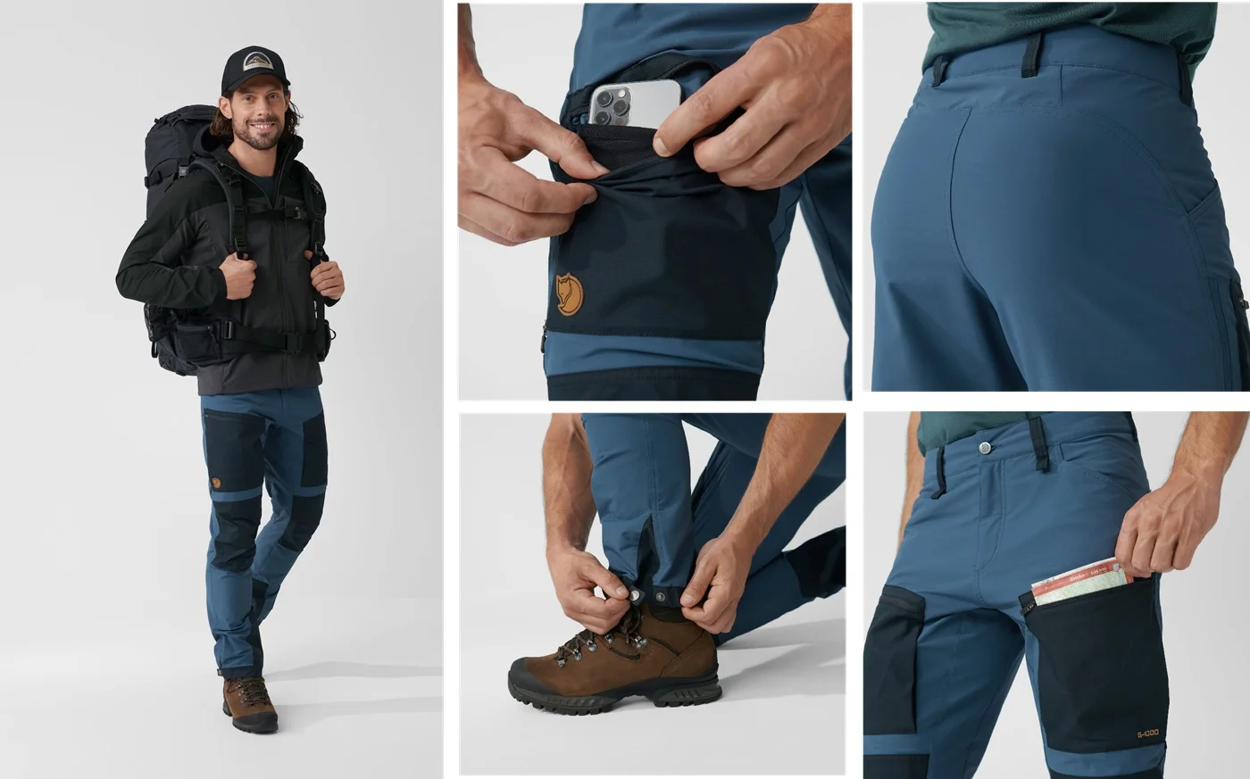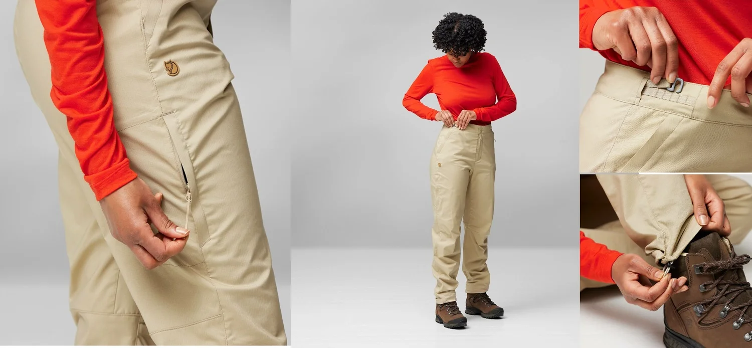 Този панталон е лек, удобен и със свободен силует, с регулируем еластичен колан и с вентилационни отвори. Краищата на краката също са регулируеми и могат да бъдат навити лесно, когато времето е наистина горещо, което го прави отличен избор за туризъм в топъл климат. Abisko Hike може и лесно и компактно да се сгъне и прибере. Изработен е от G-1000 Air Stretch с рециклиран полиестер и минимално количество чист полиестер за поддържане на еластична функционалност, както и органичен памук. Панталонът е с висока талия и спокойно прилягане. Тежи 317 гр. при размер 38.