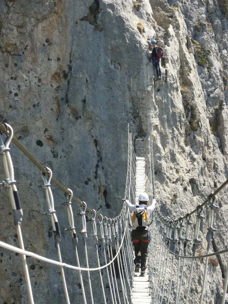 В тази виа ферата има няколко акцента. В дъното има дълъг телен мост, между два скални върха, но той е само за да загреете. Тогава изкачването става вертикално. Ще прекарате доста време на метални стъпала, изкачвайки се по скалата с главозамайващ пад под вас. Това е сравнително лесно да се игнорира, докато не стигнете до двутеловия „мост“ (две телени въжета – едно за краката, едно за ръцете). Споменахме ли, че мостът се люлее?