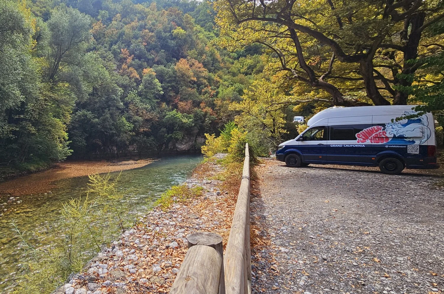 На паркинга до моста, от който тръгва маршрутът, има много приключенци с кемпери от различни страни. Там е и един от центровете за водни спортове в района. Засичаме се по моста с един винтидж предшественик на нашия Volkswagen Grand California, точно докато снимаме.