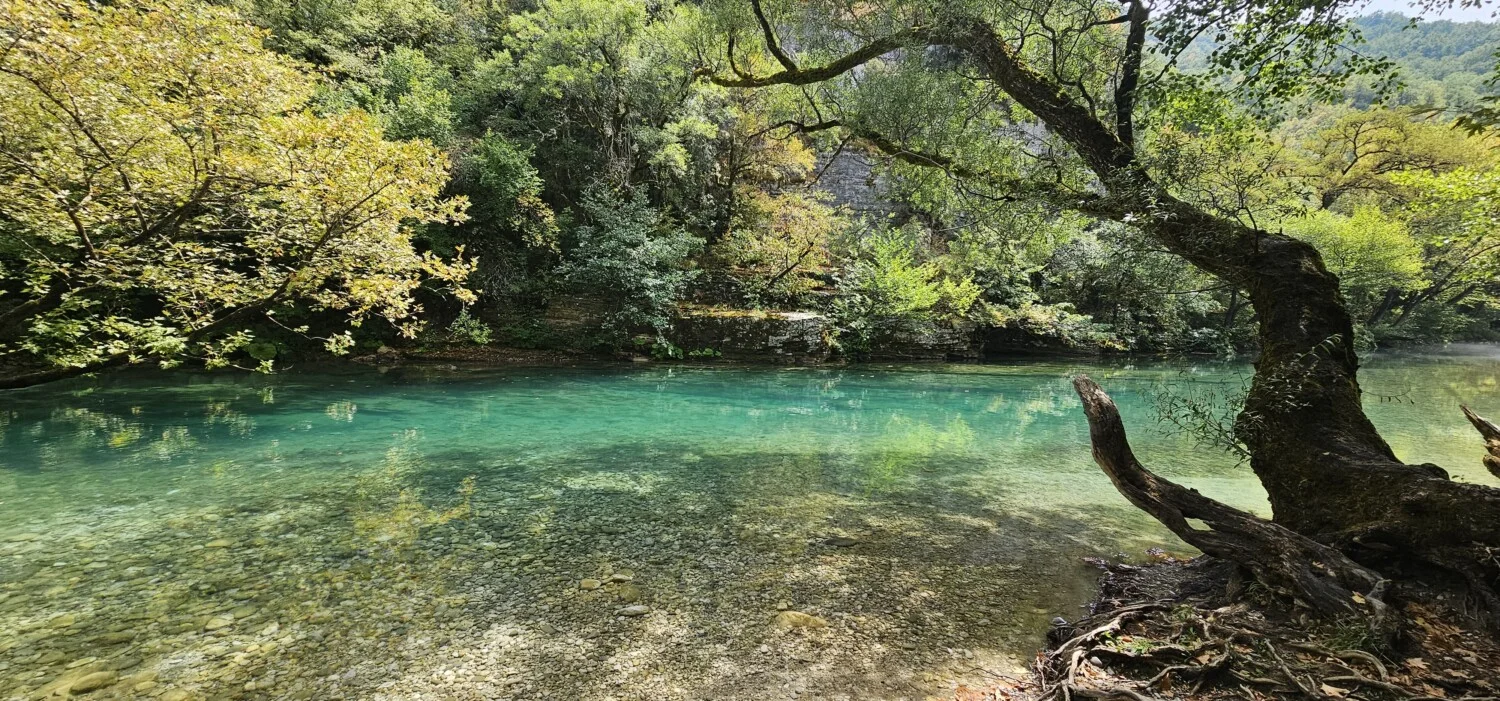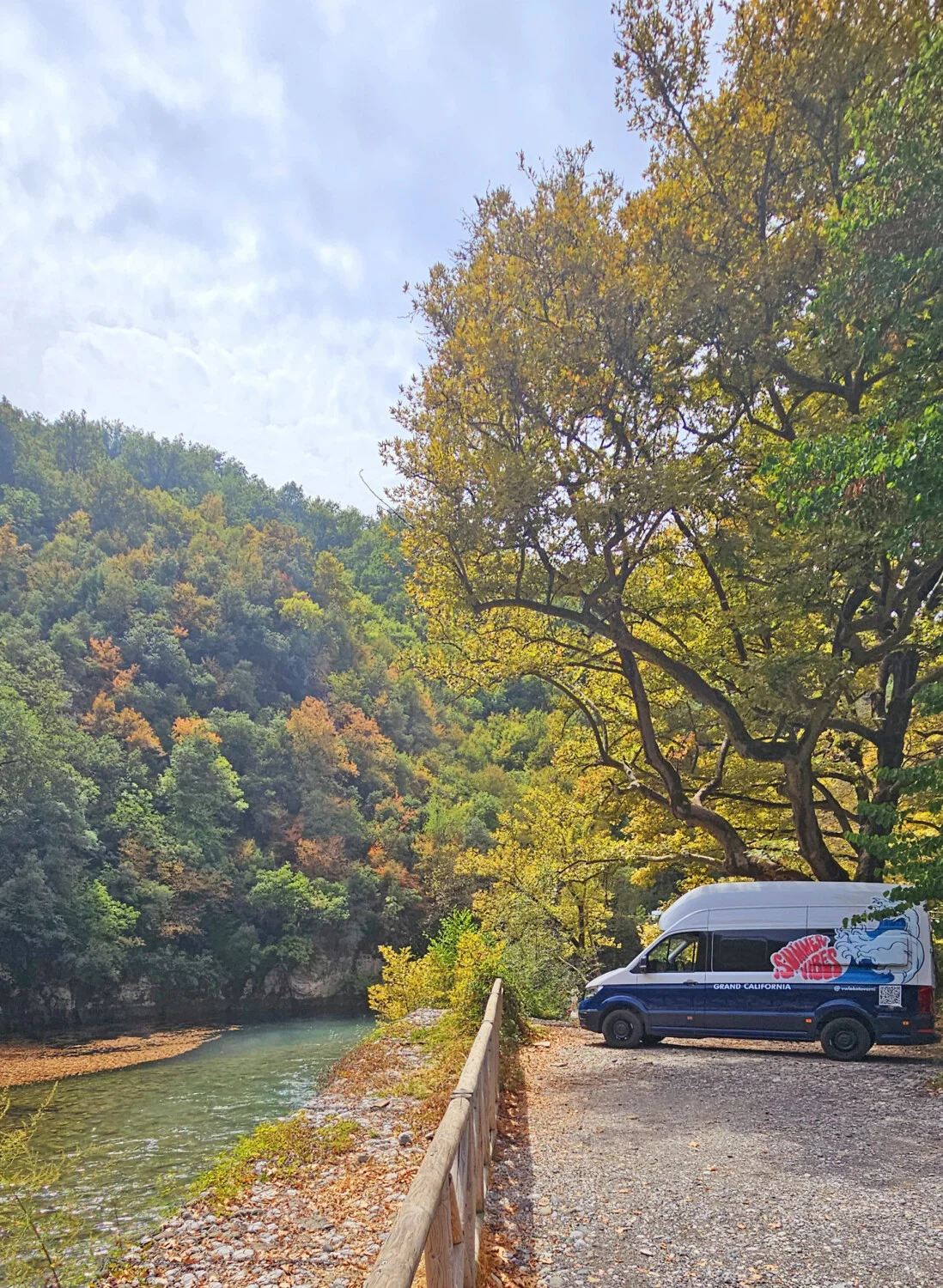 В края на цял ден, изпълнен с обиколки из каньона, избираме да нощуваме на паркинга на брега на река Войдоматис. Цветовете на реката са невероятни и решаваме, че искаме да заспим и да се събудим на брега ѝ. Наблизо има и чешма, от която пълним резервоара на буса догоре. Ако бяхме с класически кемпер, щеше да е проблематично, защото къмпингуването в Гърция не е разрешено навсякъде, но да спреш ван на паркинг, без да отваряш тента, е позволено.