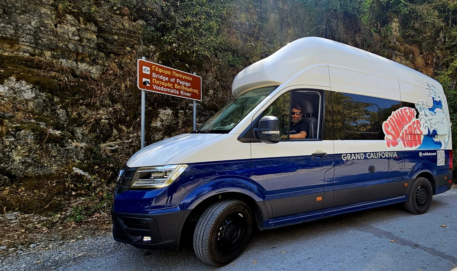 Спираме на паркингите на природните забележителности в района, където често има знаци, забраняващи престоя на кемпери, но ние сме с бус.., а и не се застояваме. Избираме си спирка с красива гледка и исторически трекинг маршрут с каменни мостове за първата ни пешеходна разходка из Викос. Спираме дома си до един от мостовете по пътеката.