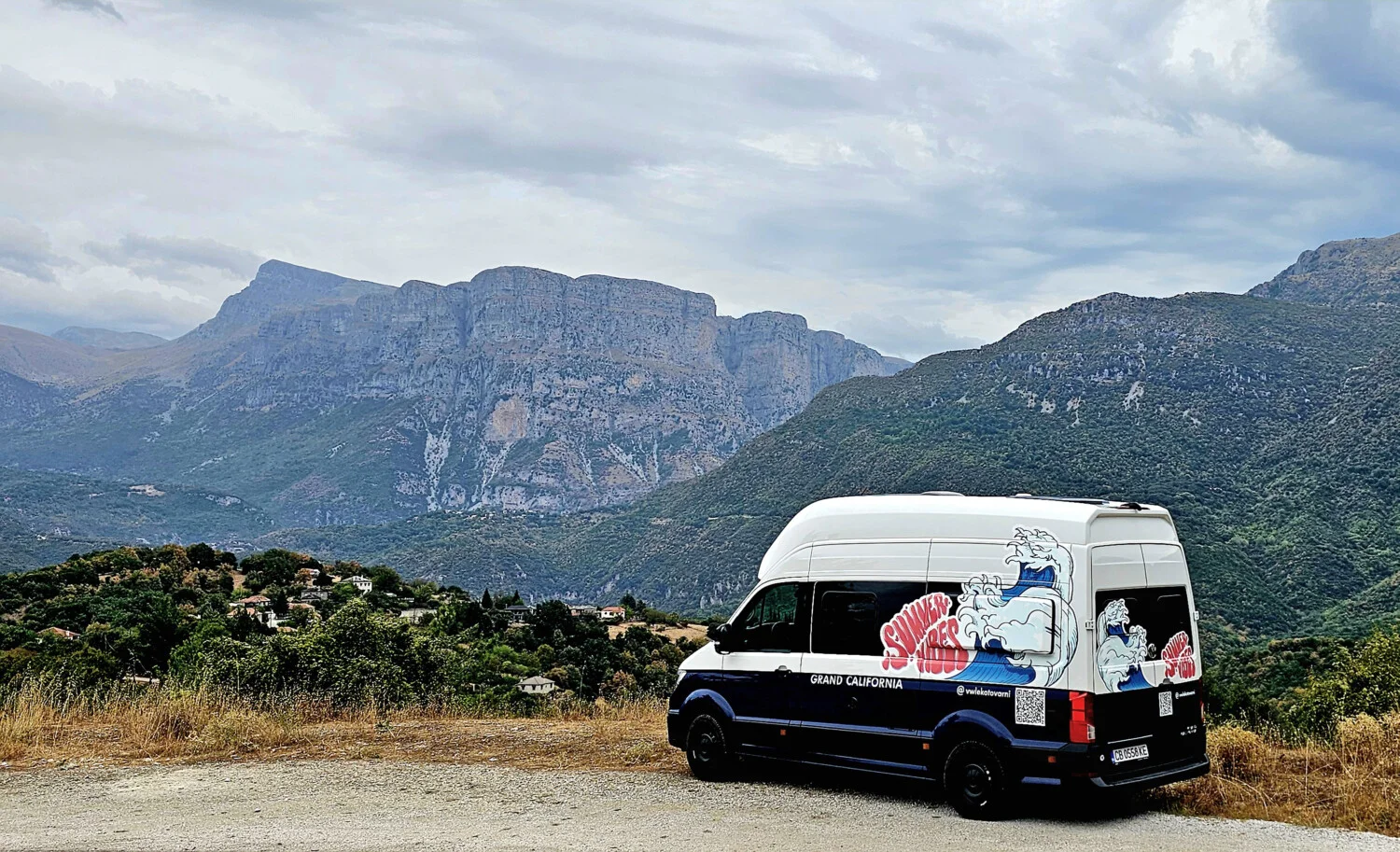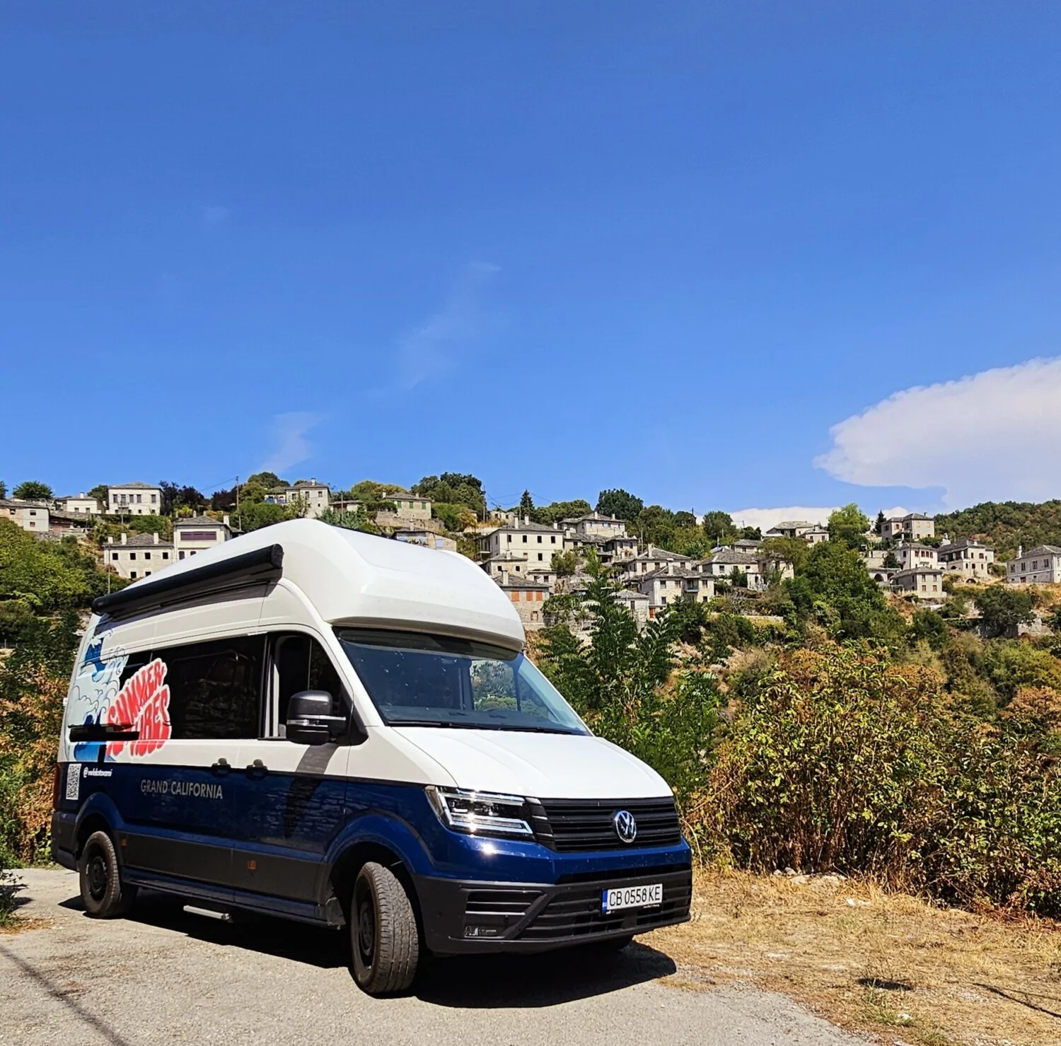 Следва товарене на багажа, зареждане на хладилника и чаршафите в новия ни дом, и сме готови да потеглим на пътешествие. Първо свързваме мобилните устройства с компютърните системи на автомобила и с радост установяваме, че работи еднакво добре с Android и Iphone. Посоката, която задаваме е планината Тимфи, част от втория по височина планински масив в Гърция – Пинд. Така пътуването започва с около 650 км каране, основно по магистрала – разстояние, което с класически кемпер би било уморително да се измине наведнъж, но с Grand California бе неусетно и приятно. Асистентите на колата, хубавият екран, на който виждаш навигацията, удобните седалки и приличният разход от около 11-12 л/100км, ни позволиха да се движим с максимално разрешената скорост 120-130-140 км в час и така, без да зареждаме за около 5 часа и малко, да стигнем до първата ни спирка.