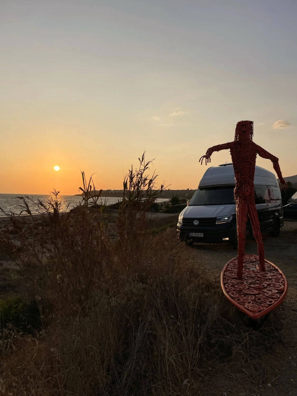 Продължаваме да се движим на юг по крайбрежието. Познаваме зоната, защото още преди години сме я разучавали с приятели сърфисти и знаем, че там е едно от добрите места за каране на сърф по вълни в Гърция. Обикаляме спотовете, които са толкова много, че им изгубваме броя. Прогнозата не е за хавайски сърф, но виждаме много кайтисти. Духът на сърфа обитава всичко наоколо – интересните скулптури със сърфисти, типичните кафенета и самите плажове, тематичните графити по стените на постройките, сега местообитание на десетки приключенци.