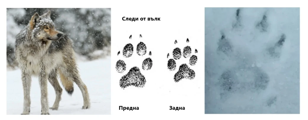 Вълк: Следата е по-издължена и симетрична, с по-ясно изразени пръсти и централна възглавничка.