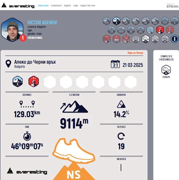 Между 21 и 23 март той изкачи 19 пъти Черни връх и натрупа положителна денивелация от 9114 м, изминавайки 129,03 изминати км. Това му отне 46.08 часа, без сън.