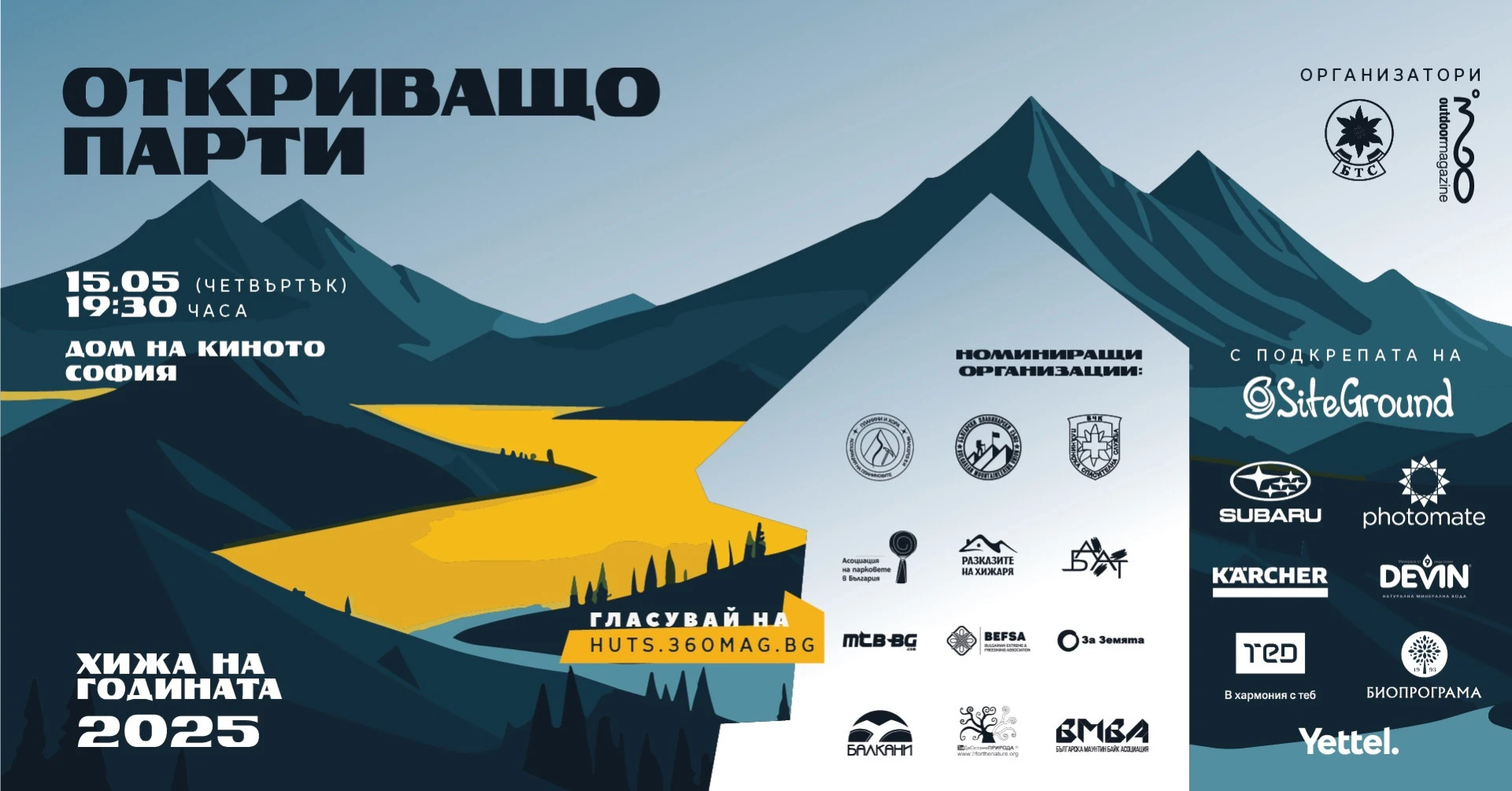 Откриващо събитие - старт на кампанията “Хижа на годината” 2025Днес, с официално събитие в столичния “Дом на киното” ще бъде даден старт на кампанията “Хижа на годината” 2025. За трета поредна година тази  инициатива, посветена на българските планини и хората, които ги обитават и обичат, се реализира от 360mag.bg и Български туристически съюз. Гласуването ще бъде активно от 19:30 ч. на 15 май на сайта huts.360mag.bg и ще продължи до 30 септември.