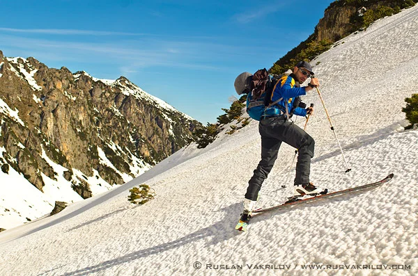 Предния ден е валял дъжд, през нощта е стегнало здраво, а коланите яко стържат по заледения сняг. Започваме качването към БАК от Втора тераса, което се оказва доста психарско и технично. Успяваме да обърнем по три пъти ските, а на четвъртия дясната ска на Кофето се откача и двамата слизат скоропостижно до началото на склона. Аз почти съм напълнил гащите, но с върховна концентрация успявам да изкретам догоре. Кофето отдолу псува и вече догонил ската си, кове нагоре по обувки. Кучетата нямат проблем – здравите котки (нокти) и големият опит в планината ги изкарва нагоре безаварийно.