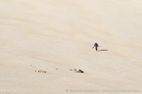 Стигаме до БАК, а малко след това се изкачваме и до премката между Ловница и Камилата. Кучетата се катерят по околните скали, душейки следите от диви кози, а ние се радваме на гледките. Сахарският пясък, донесен от последните снегове, е обагрил в жълто склоновете, а стичашият се по тях дъжд от предишните дни е изваял красиви форми по пътя си надолу. Очаква ни малко спускане по приятно размекнат източен склон, но преди това и двамата вадим апаратите и се отдаваме на петминутна фотосесия.