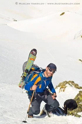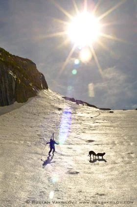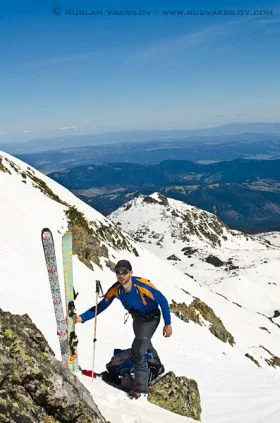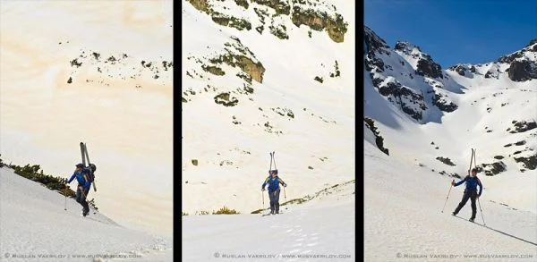 След известно чудене как да подходим към върха, решаваме да тръгнем директно по улея за да го видим в какво състояние е. Почти веднага сваляме ските и тръгваме по обувки, съжалявайки, че не сме си взели котки. Всяка стъпка нагоре изисква три силни ритника за да пробие заледения сняг. Към средата на изкачването прасците и бедрата ни пищят от болка, а ние осъзнаваме, че май няма да се спуснем от тук, освен ако не изчакаме 2 часа на върха. Кучетата отново са с нас, но този път и те бедстват. Мурджо и Шаро са доста умни и чинно вървят след нас по изкопаните стъпки, без да ни припират, че се бавим и спираме за почивка твърде често. Само Сара решава да атакува върха по собствена линия. Дали от глупост, дали от нещо друго, овчарката си избира най-тесния, стръмен и заледен кулоар над нас, драпа отчаяно с нокти и рискува всеки момент да се свлече през скалите до дъното на склона, вероятно повличайки поне един от нас. Наистина, доста критично, но все пак песът му с пес се справи и излезе на безопасно място, а ние си отдъхваме, че ще минем без спасителна акция на куче.