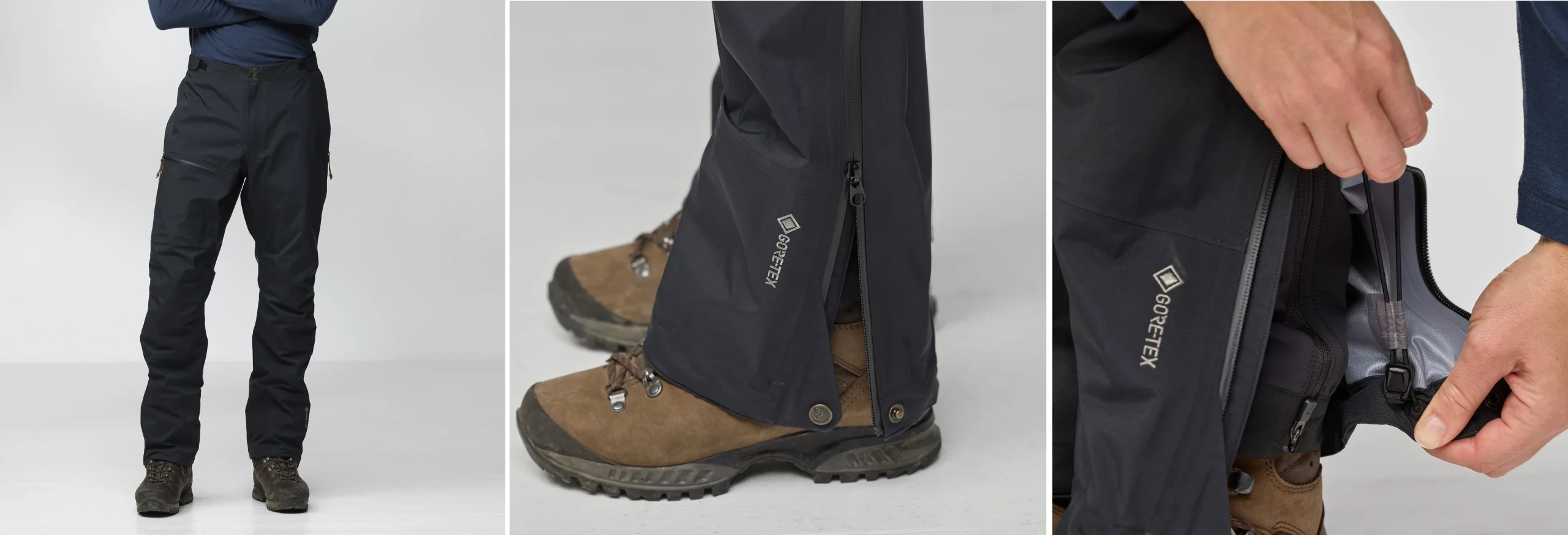 Проектирани да се носят като външен слой върху туристически панталони, те разполагат с дълги, водоустойчиви двупосочни странични ципове, които осигуряват ефективна вентилация и улесняват обличането и събличането.