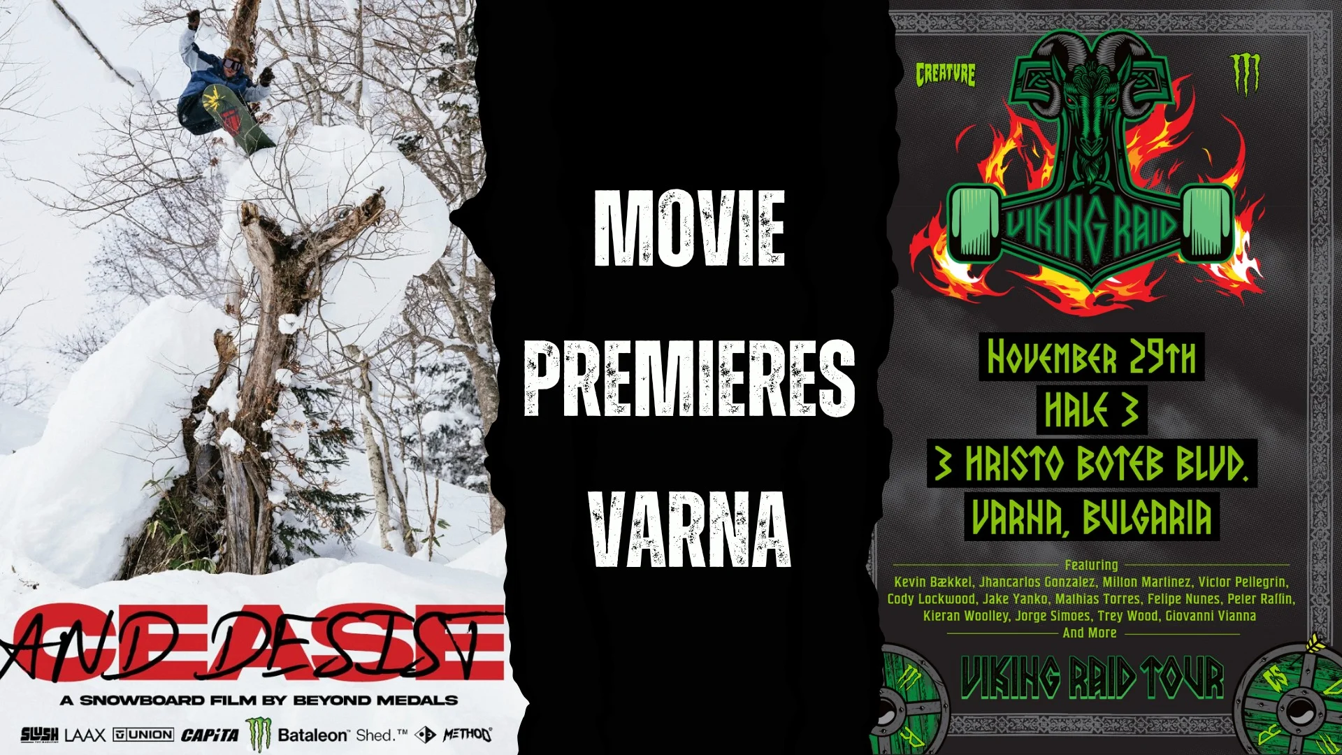 Два епични филма, подкрепени от Monster Energy, ще направят своята премиера: „Monster & Creature “Viking Raid Tour“ и „Beyond Medals „Cease and Desist“ ще зарадват феновете на скейта и сноуборда в края на ноември. Прожекциите ще са на 28 и 29 ноември в София и Варна, с вход „Свободен“, приятна компания и много готина музика!