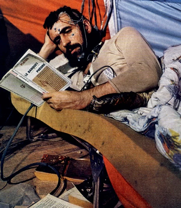 Така, на 17 юли 1962 г. той слиза на 130 м дълбочина, до подземен ледник, в постоянна температура около 3°C и влажност 98%. Живее в палатка, до него е само слаба лампа, сухи дажби и телефонен кабел към повърхността, по който съобщава на екипа кога ляга да спи и кога се събужда.