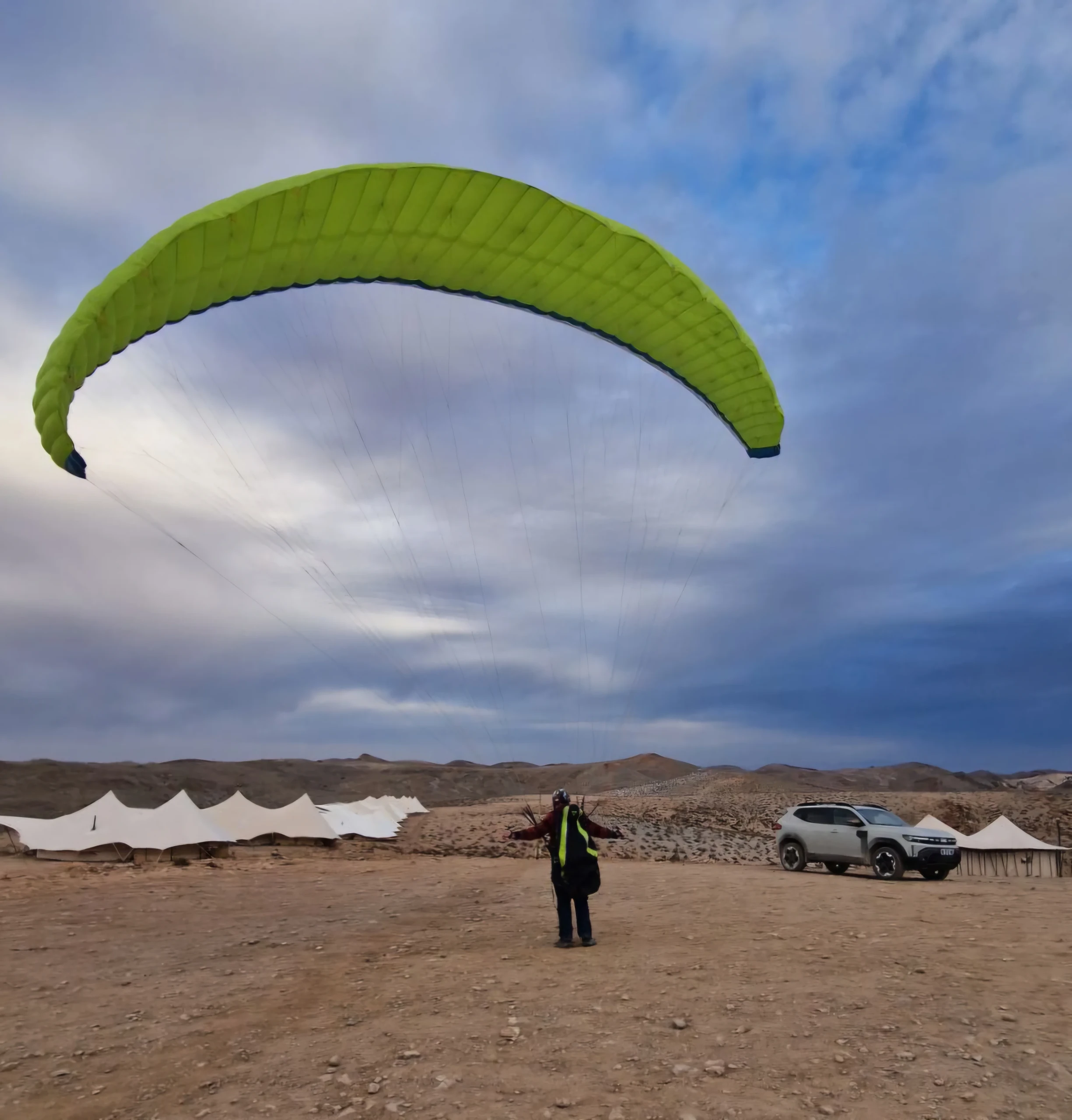 След като се отбихме от асфалта и навлезнахме в Агафай, започнахме да срещаме камили, ATV-та, кросови мотори, а в далечината се откриваше гледка към заснежените Атласки планини. Контрастът между каменната пустиня и белите върхове създаваше почти извънземно усещане. Това е едно от нещата, което прави тази пустиня уникална. Пейзажът не е класическата пясъчна пустиня, а характерен каменен терен с много хълмове, долини и каньони. Точно заради хълмчетата бяхме донесли с нас и парапланер с идеята да изкачим колата до някой по-висок връх и да излетим от него.