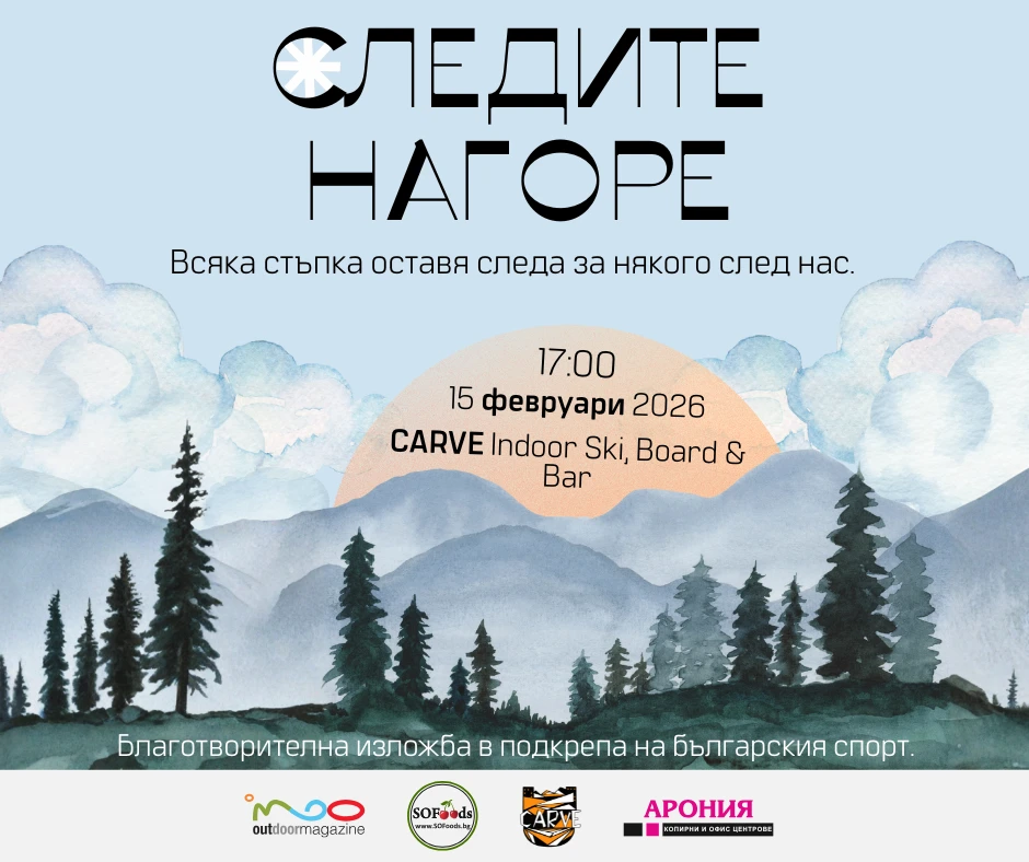 На 15 февруари 2026 г. от 17:00 ч. планинският бар Carve в София ще бъде домакин на благотворителната планинска изложба „Следите нагоре“ – събитие, което естествено съчетава любовта към планините, личните истории и подкрепата за развитието на българския спорт.