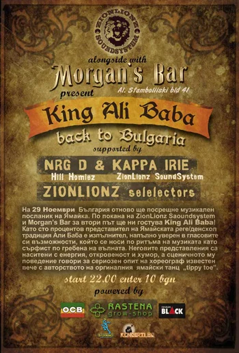 На 29 Ноември София отново ще посрещне музикален посланик на Ямайка. По покана на Зайън Лайънз Саундсистем и Morgan’s Bar за втори път ще ни гостува King Ali Baba! Като раста вестител на Светлината, той стъпи в нашата действителност още през 2008, за да остави трайна следа в съзнанието на всички, които имаха щастието да го чуят на живо в клуб Пулс.