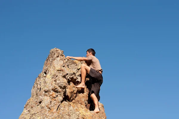 Толкова е диво това място, че и Ясен взе, че подивя. Не се сдържа, събу се бос и започна да се катери по скалите в района. Движенията му са отмерени и плавни. Изкачва се с лекота и застава радостен на острия ръб.