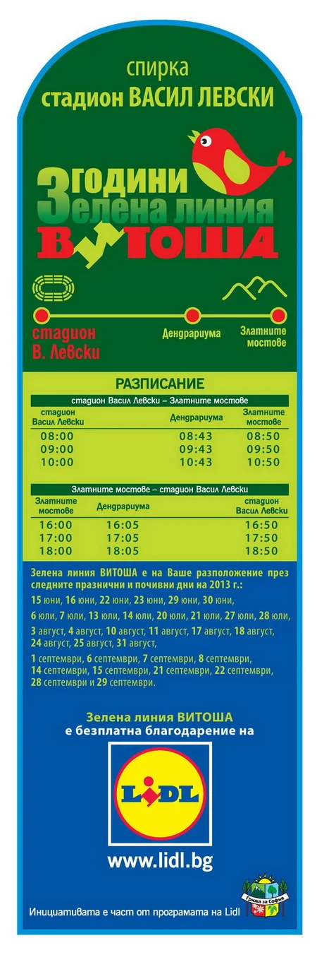 За трета поредна година Lidl пуска 3 безплатни автобуса до Витоша, които ще циркулират уикендите и празничните дни. Автобусите тръгват от стадион „Васил Левски“, спират на „Дендрариума“, а финалната спирка е „Златните мостове“, като тръгването е в 8, 9 и 10 часа, а наобратно – 16, 17 и 18 часа.