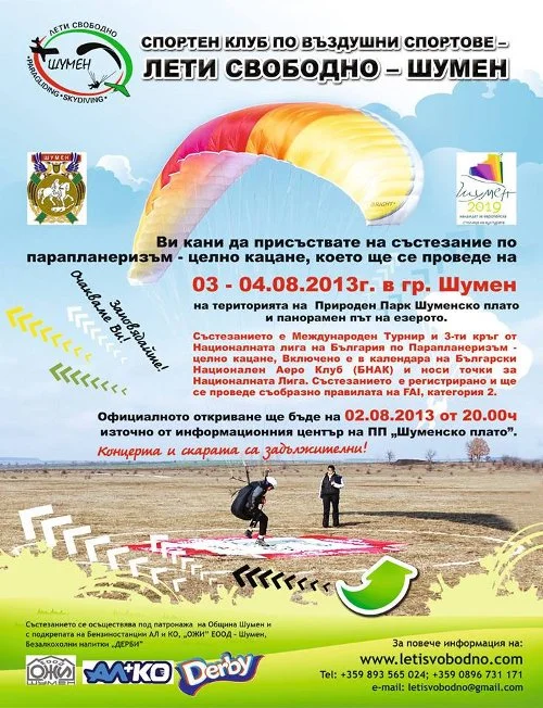 Спортен клуб по въздушни спортове „Лети Свободно” от Шумен кани всички любители, състезатели и техните приятели на състезание по парапланеризъм целно кацане – „Лети свободно – Шумен 2013“, което ще се проведе от 2 до 4 август.