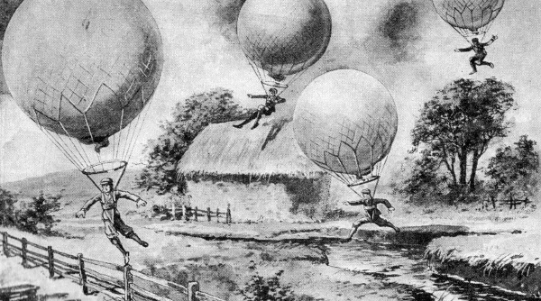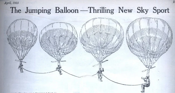 „Ако тежите 80 килограма и искате да се забавлявате, трябва ви каишка на гърба и балон, който може да повдигне 60 кг. След това сте готови да се отдадете на спорта скокове с балон. Забавлението включва разходка по земята с подскоци и полъх на вятър в гърба. После можете да се доближите до съседната ограда, да свиете колене и да се понесете леко във въздуха, преминавайки над нея. Ще се носите, подскачате, „плавате“ във въздуха, толкова лесно и нежно, че ще бъдете изненадани. По-големи препятствия, като къщи и дървета, ще могат да бъдат преодолявани с едно просто и енергично подскачане, подобно на скок от скала в морето“… това не е извадка от фантастичен роман, а реклама на балони за скачане през 20-те години на миналия век.