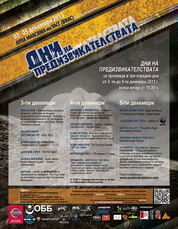 Между 3-ти и 5-ти декември ще можем за девета поредна година да се покатерим, скочим, гмурнем и изгубим в Дните на предизвикателствата. Ще можем да видим част от най-екстремните, приключенски истории случили се през годината, да направим равносметка на постигнатите мечти, изкатерените върхове и надскочените летви. Ще можем и да се срещнем със себеподобни съвременни номади.