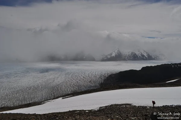 След „най-голямото ни изкачване“ – до около 1200 м.н.в., излязохме на прохода към ледника Грей – едно огромно ледено поле. Духаше толкова силен вятър, че, ако не бяха тежките раници, щеше да ни отвее, а Татяна (като по-лека) трябваше да мине последните 50-60 метра лазейки.