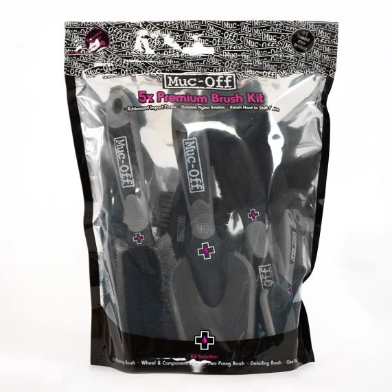 Комплект от пет четки в удобна чанта за съхранение, които ще почистят рамката, колелетата и компонентите, като същевременно ще придадат деликатен завършек. Влакната са високоустойчиви, а гумираните зони по дръжката осигуряват максимална защита, дори в най-екстремните условия.