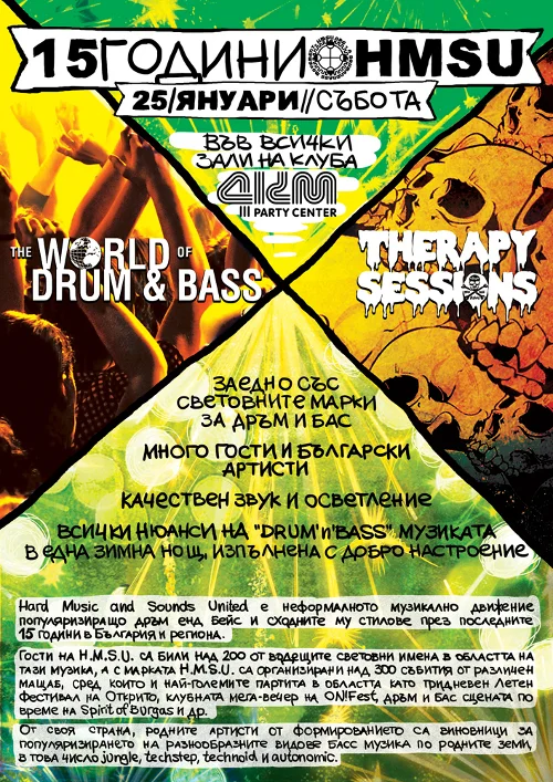 На 25 януари 2014 ще отбележим 15 години от старта на H.M.S.U. – абревиатура, която мнозина отъждествяват с дръм енд бейс-а в България. По случая се подготвя грандиозно събитие, което обещава да изпълни с качествена музика и четирите зали на Парти център 4КМ в София.
