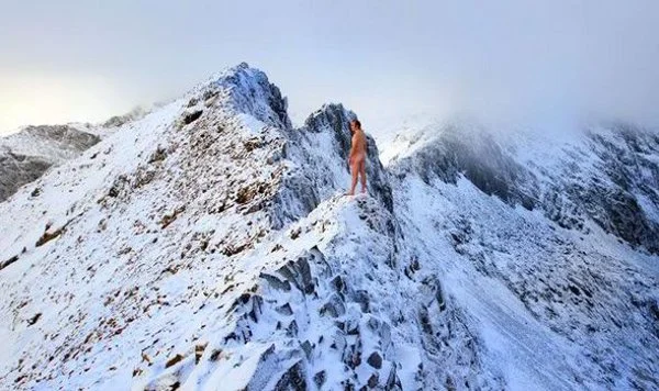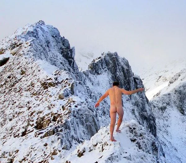 Фотографът Дан Аркъл шокира сънародниците си, изкачвайки гол в зимни, нощни условия вторият по височина връх в планината Сноудън, Уелс.