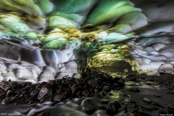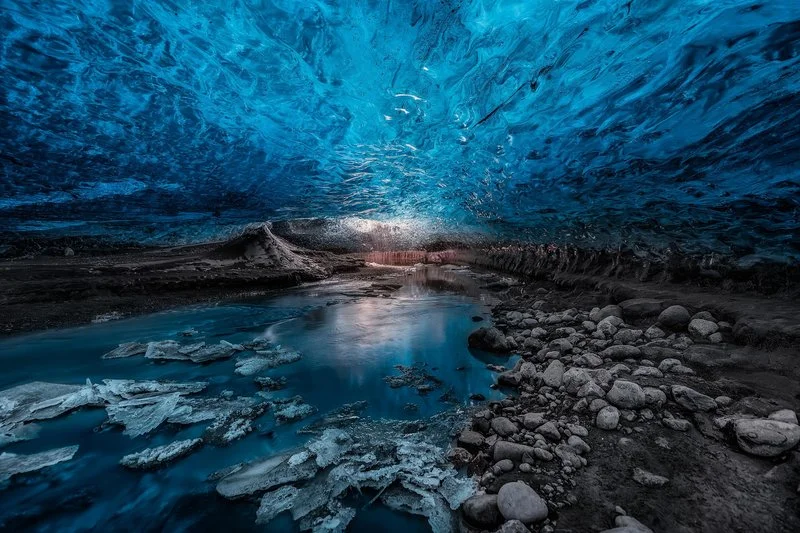 Глетчерната пещера Ватнайокул в Исландия е създадена изцяло от лед. Ледниковите пещери са най-подходящи за посещение през есента и зимата, когато е малко вероятно ледът да се срине, а ледниците не се движат толкова бързо. Много от ледниковите пещери като Ватнайокул имат ярък син цвят.