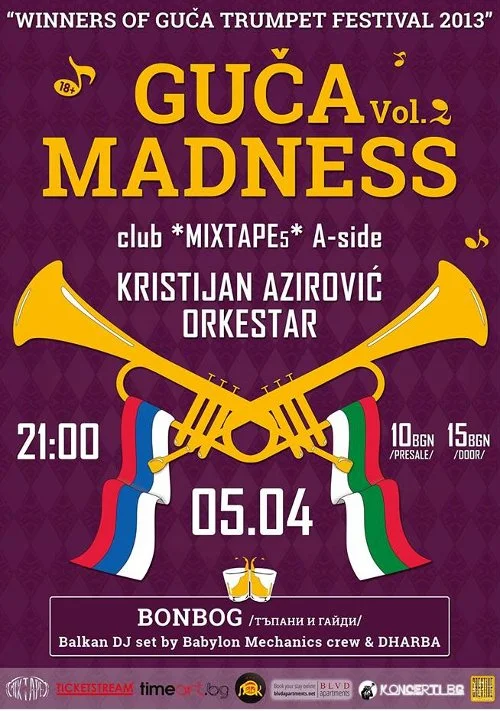 Балкански музикален колорит ще се лее в клуб *MIXTAPE 5* тази събота – 5 април от 21 ч. Поводът е Guča Madness vol.2 – второто гостуване в България на победителите от най-големия международен фестивал за духова музика в Гуча. KRISTIJAN AZIROVIĆ Orkestar ще се развилеят със своята Гуча лудост до екстремност, а 360° пък ви предлага да станете част от нея.