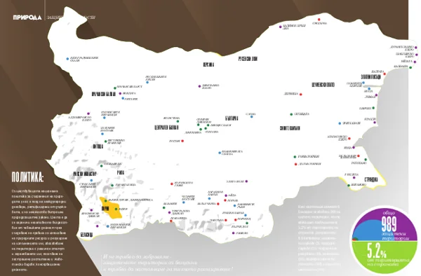 Към настоящия момент в България са обявени 989 защитени територии, които обхващат приблизително 5,2% от територията на страната, разграничени в 6 категории: национални паркове (3), природни паркове (11), поддържани резервати (35), резервати (55), природни забележителности (349) и защитени местности (536).
